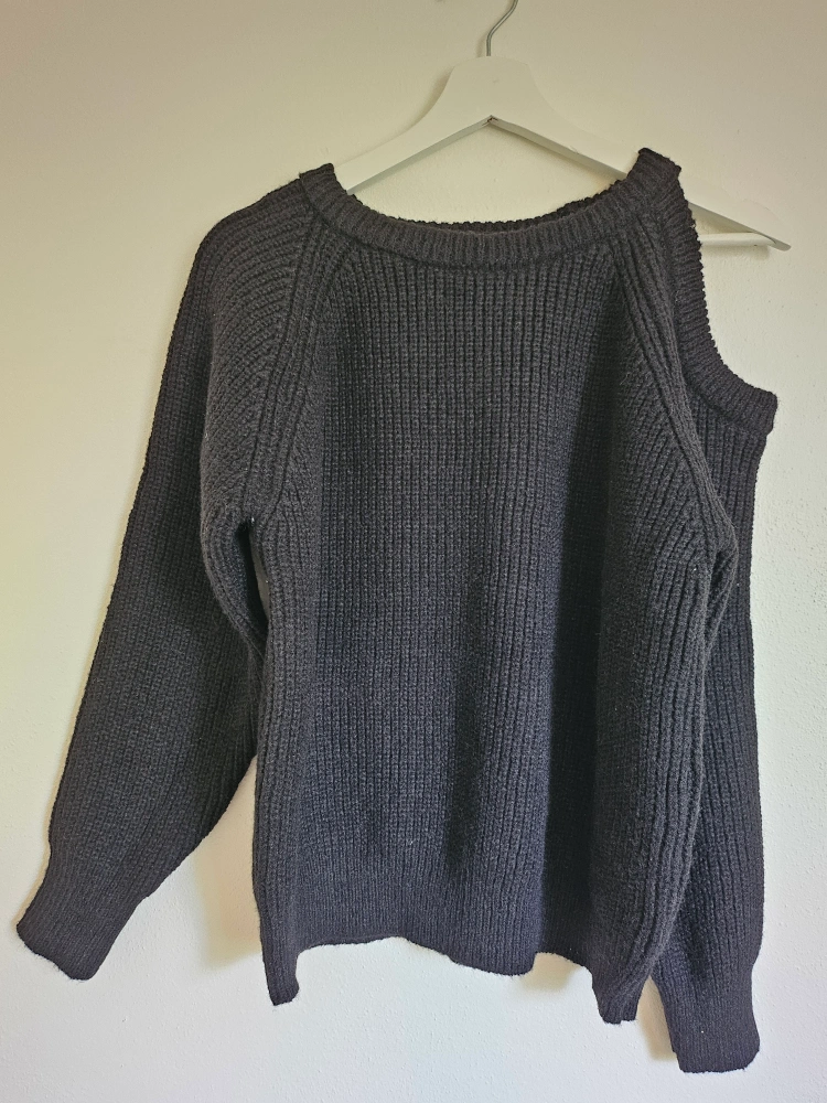 Here's a cozy black knit sweater with a unique one-shoulder design! Brand new and ready to add a bit of edge to your wardrobe. The material is soft and comfortable, perfect for those cooler days.