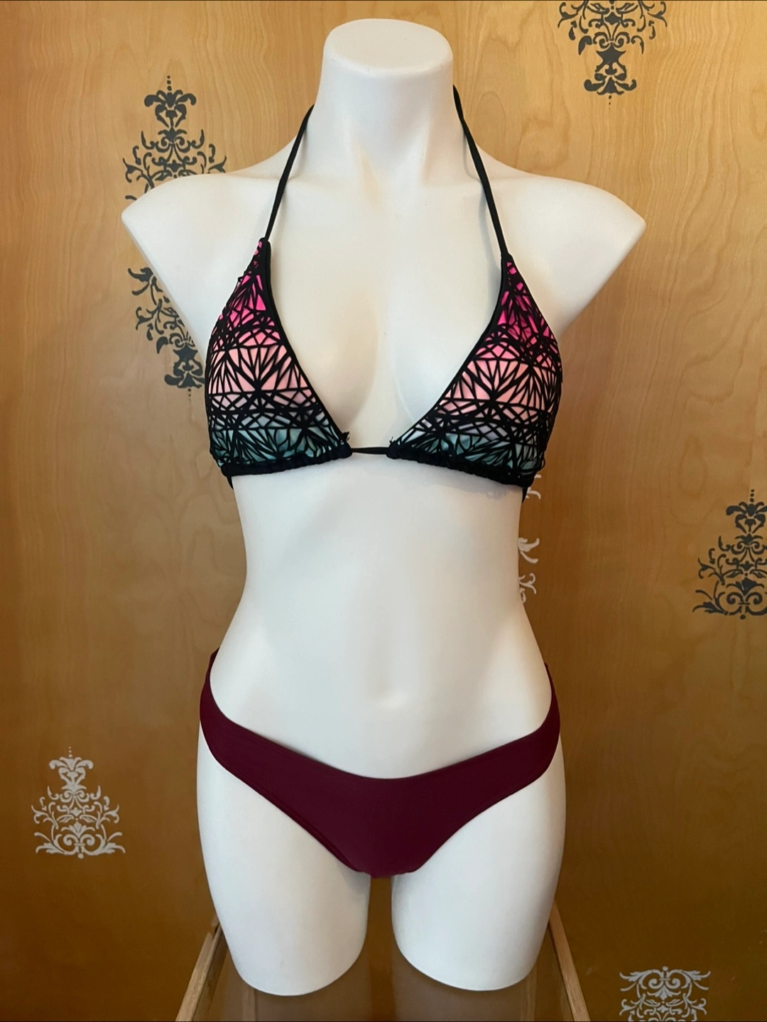 Vintage Y2K Colorful Geometric Bikini Set Triangle Top High Rise Purple Cheeky Bottoms XS/S 💎RARE FIND!!! ✅CERTIFIED AUTHENTIC VINTAGE 2000s Y2K ITEM! Condition: 10/10! Never worn -New Without Tag! Protective sticker on garment still on! Measurements Inches: Mannequin is an overall size Medium Top Tag Size: Small (XS) US: 4-8 Bust: 30-34 Cup Size: AA-B Bottoms: Small Booty: 33-36 Waist: 24-28 Cheeky Bottom Height: 18-25 Cheeky Bottom Width: 28-33 Style Top Details: Triangle shape Halter straps Adjustable tie strings Great support and comfort - adjust to your bust size Colours: shading colours of pink, blue, peach, purple, etc., Geometric net design & double layer material Bottom Style Details: Cheeky bottoms High rise Colour: eggplant purple (dark purple)