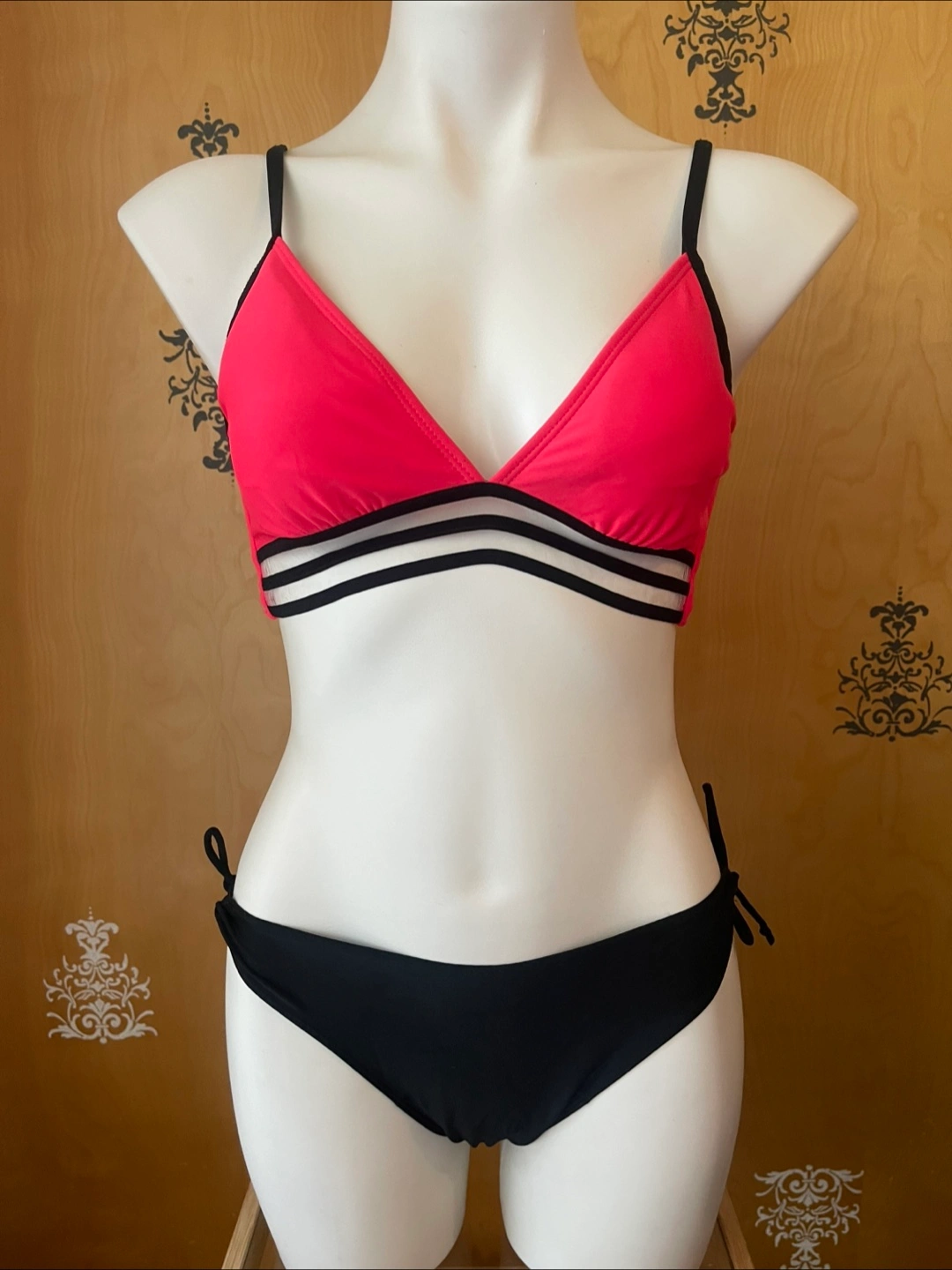 Vintage 2000s Y2K Bikini Set Neon Pink Bralette Top Black Adjustable Tie Sides Low Rise Bottoms S/M Condition: 10/10! Never worn -New Without Tag! Protective sticker on garment still on! ✅ Certified authentic vintage early years of the year 2000s 💎RARE FIND ITEM - PERFECT STYLE FOR Y2K LOVERS!!! Size: Mannequin is a size Medium Top Tag Size: Large BUT fits more of a Small/Medium US: 6-10 Bust: 32-38 Cup Size: A-C Bottoms: Small/Medium Waist: 27-30 Hips: 36-40 Top Details: Bright neon pink with black outlines See through striped outline bottom hemline of the top Thin supportive adjustable ‘bra-like’ straps - dual style/look: sportive perfect for water sports & cute minimalist Y2K style Three hook-eye style loops to fit a variety of sizes - XS to Medium - adjustable for your own personal comfort Bottoms: Black Adjustable tie strings Great coverage - dual style/look - water sports & casual beach vibes Low rise