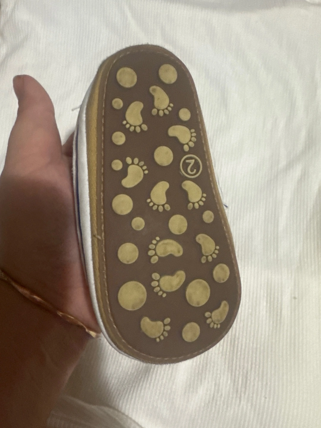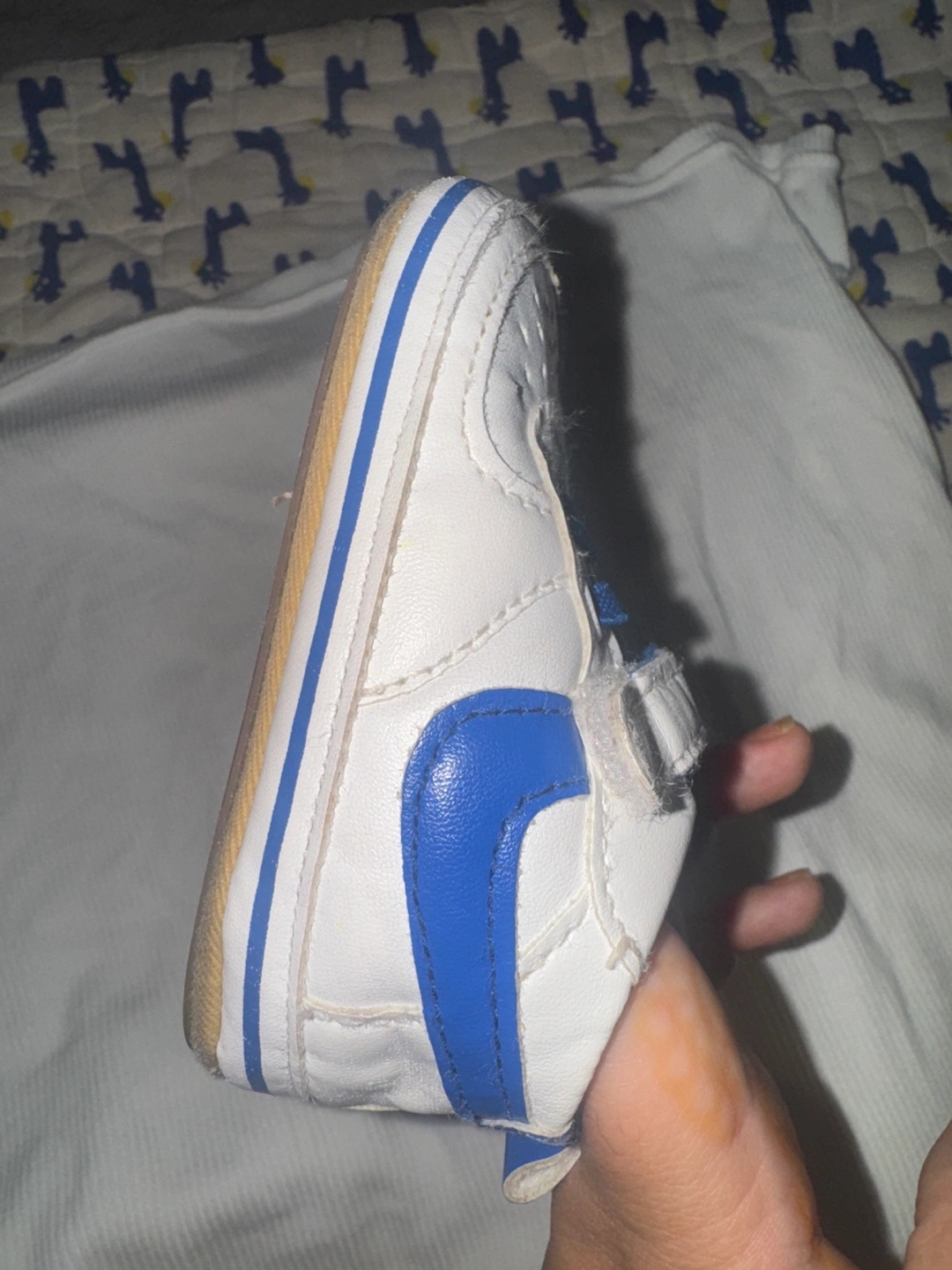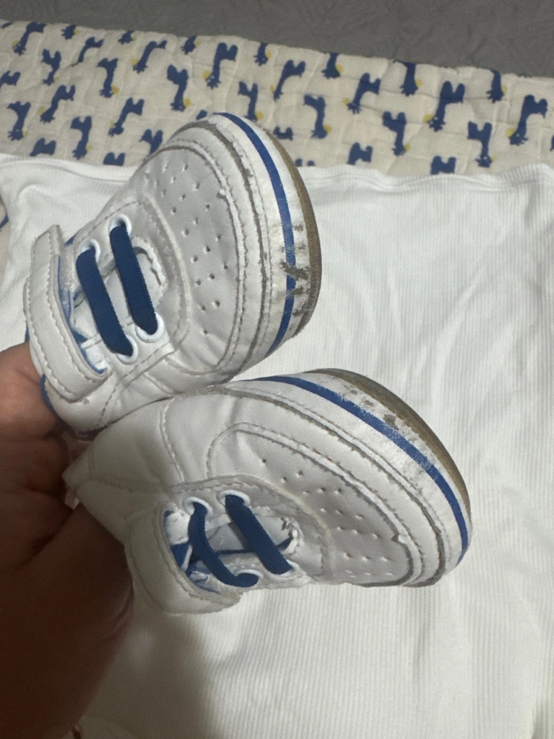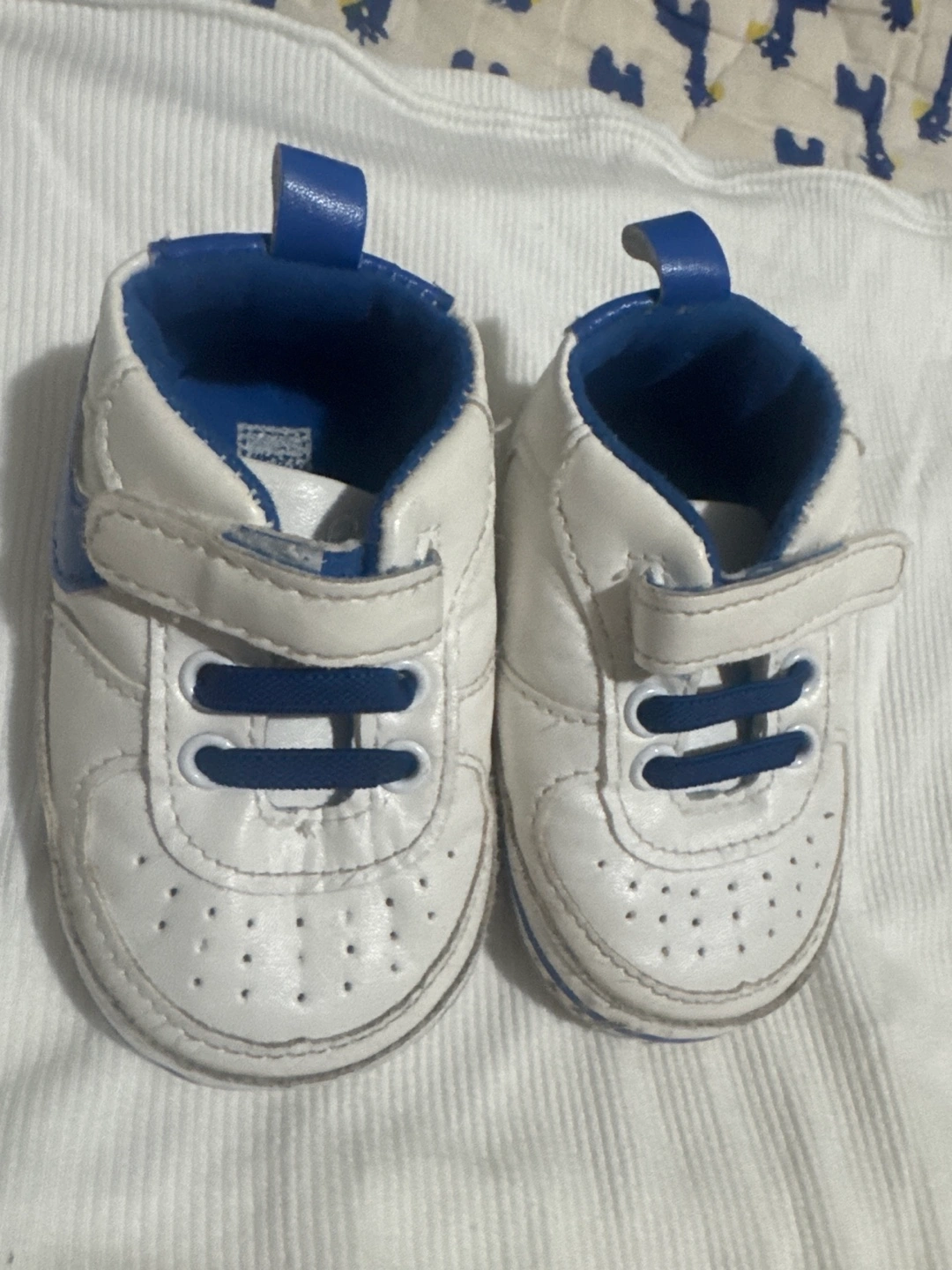 Selling a pair of baby shoes in size 2 (12cm) They are white with blue accents. They have some signs of wear as I have put on the picture.