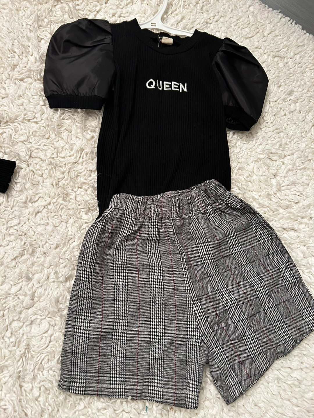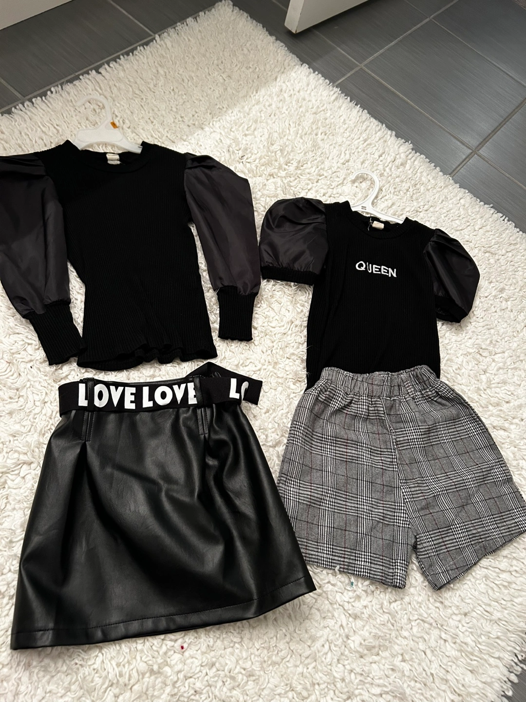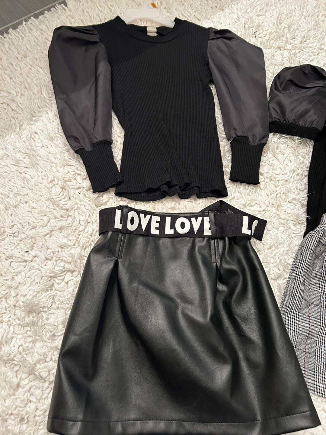 A cute set of girls' clothes, perfect for mixing and matching! Includes a black top with puffy sleeves, a faux leather skirt with a "LOVE" belt, and plaid shorts. All in great condition and ready for a new home!