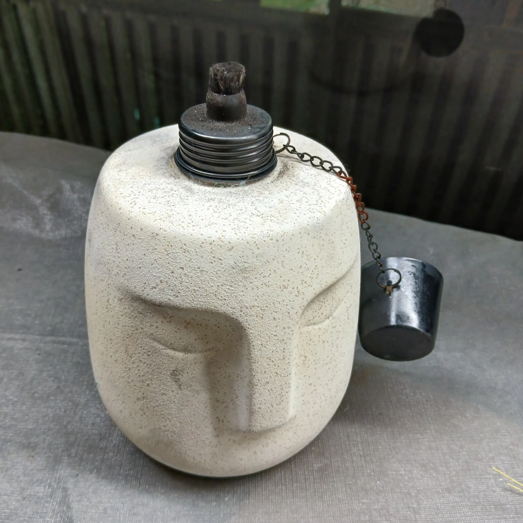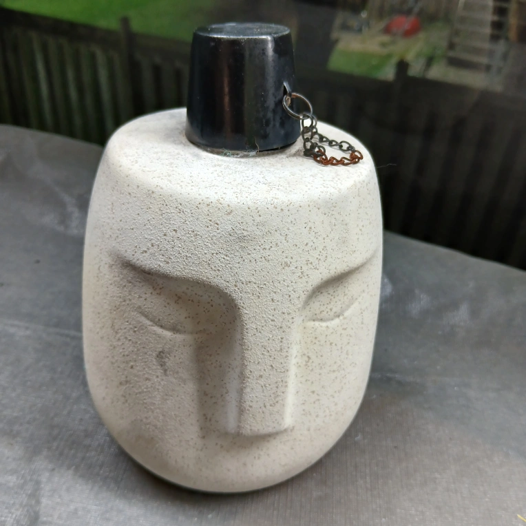 This unique outdoor tiki torch features a face design. It's perfect for adding a touch of style to your patio or garden. It is in great condition and ready for use.
