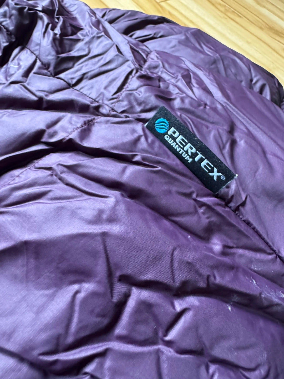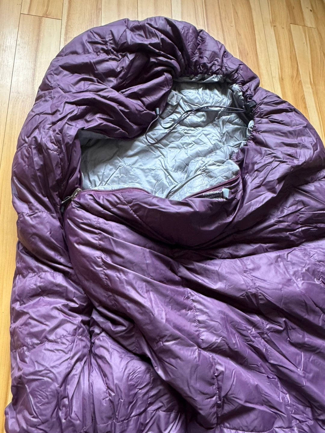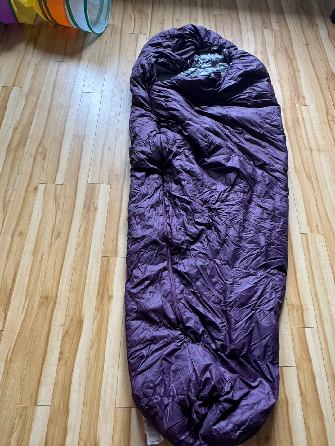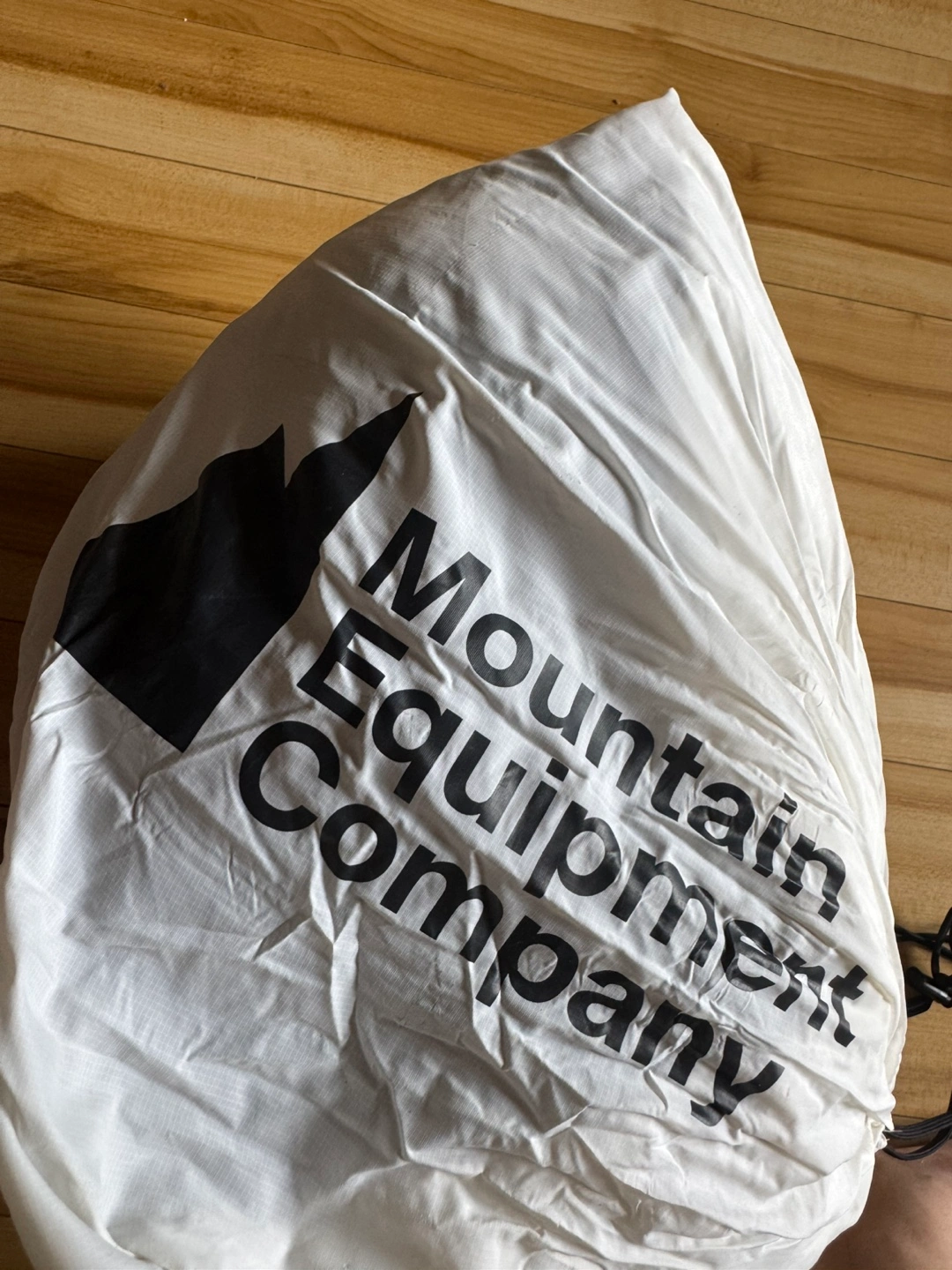 Selling a Mountain Equipment Co. sleeping bag! The tag indicates that the outer and lining are 100% nylon, while the filling is a mix of down and feathers. It comes with a stuff sack for easy storage and transport. Perfect for your next camping trip!