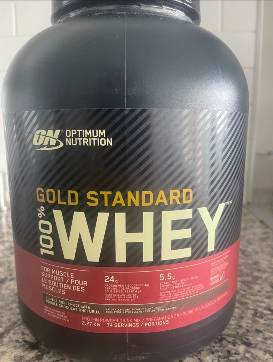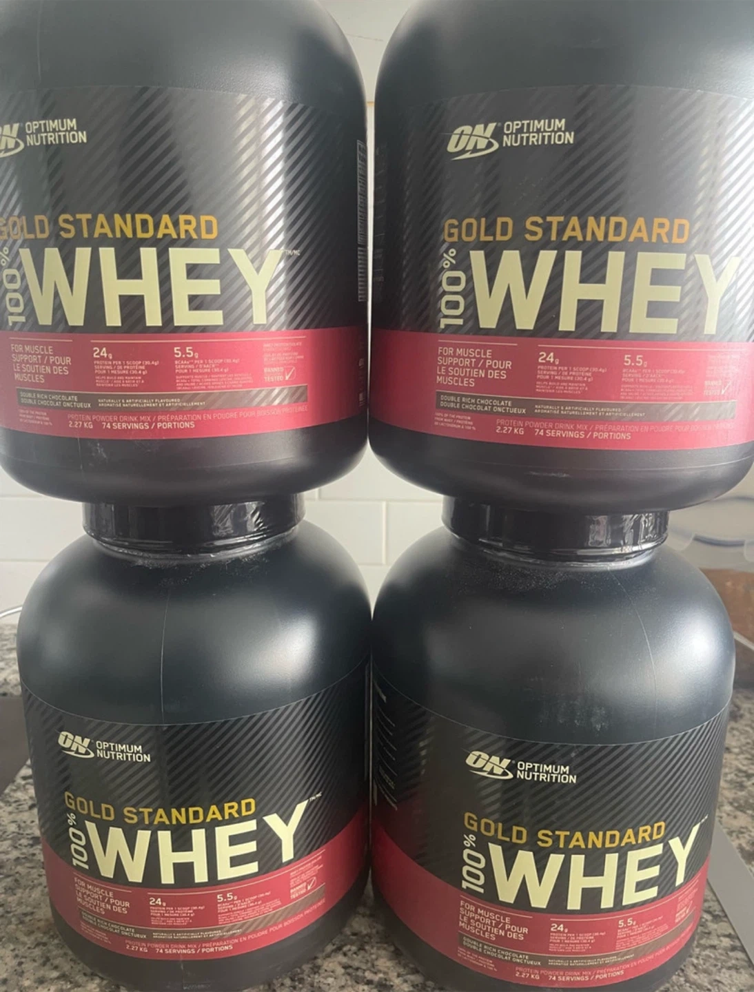 I have many containers of Optimum Nutrition Gold Standard 100% Whey Protein in Double Rich Chocolate flavour. And also vainilla flavorIt's a 5 lb (2.27 kg) container with 74 servings. This protein powder is designed for muscle support and recovery, containing 24g of protein and 5.5g of BCAAs per serving. Factory sealed Best before 5/2026