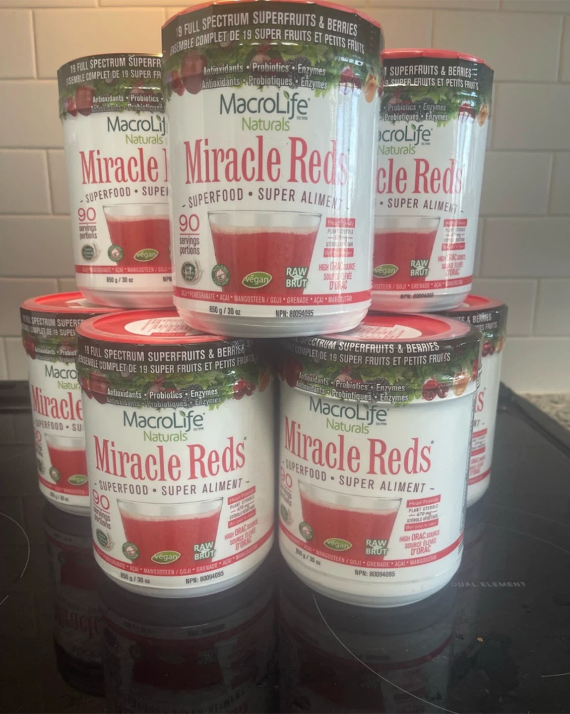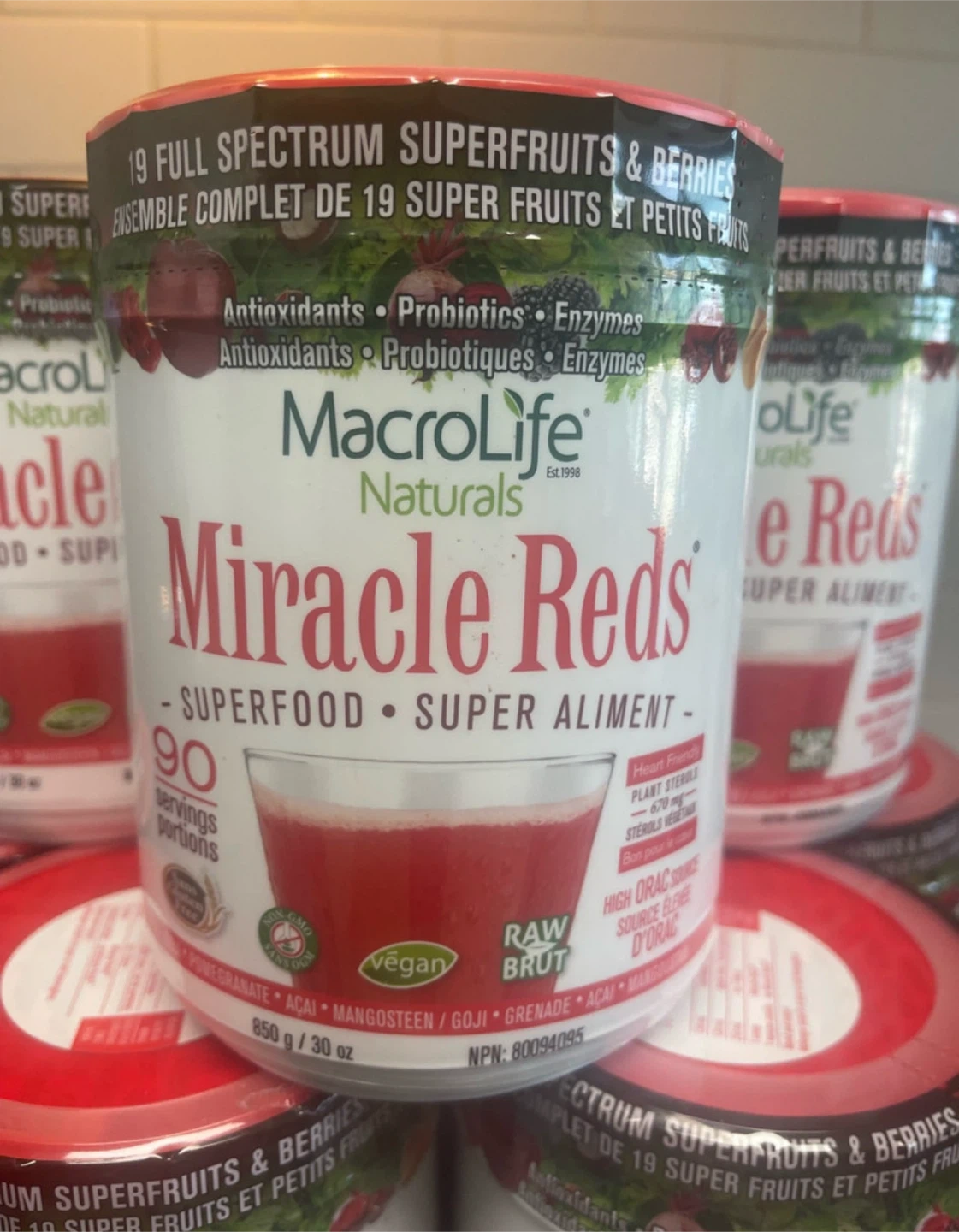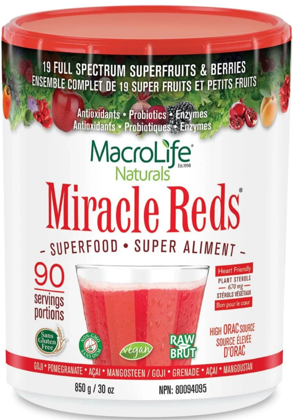 I'm selling MacroLife Naturals Miracle Reds Superfood. It's a superfood and super aliment with 90 servings per container. It contains 19 full spectrum superfruits and berries, offering antioxidants, probiotics, and enzymes. It's also vegan and gluten-free. Enjoy the benefits of plant steroids and a high ORAC source.