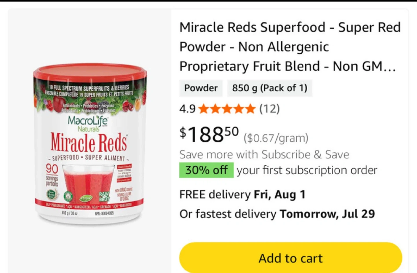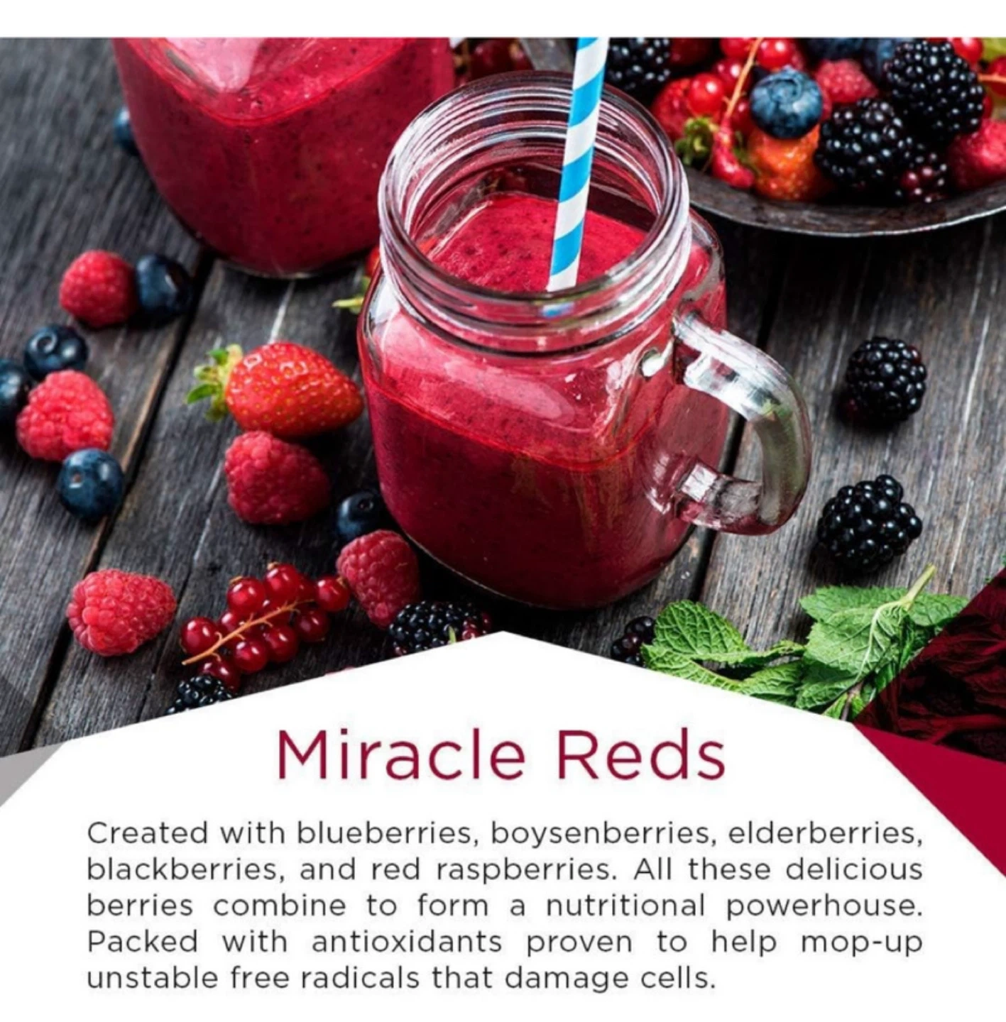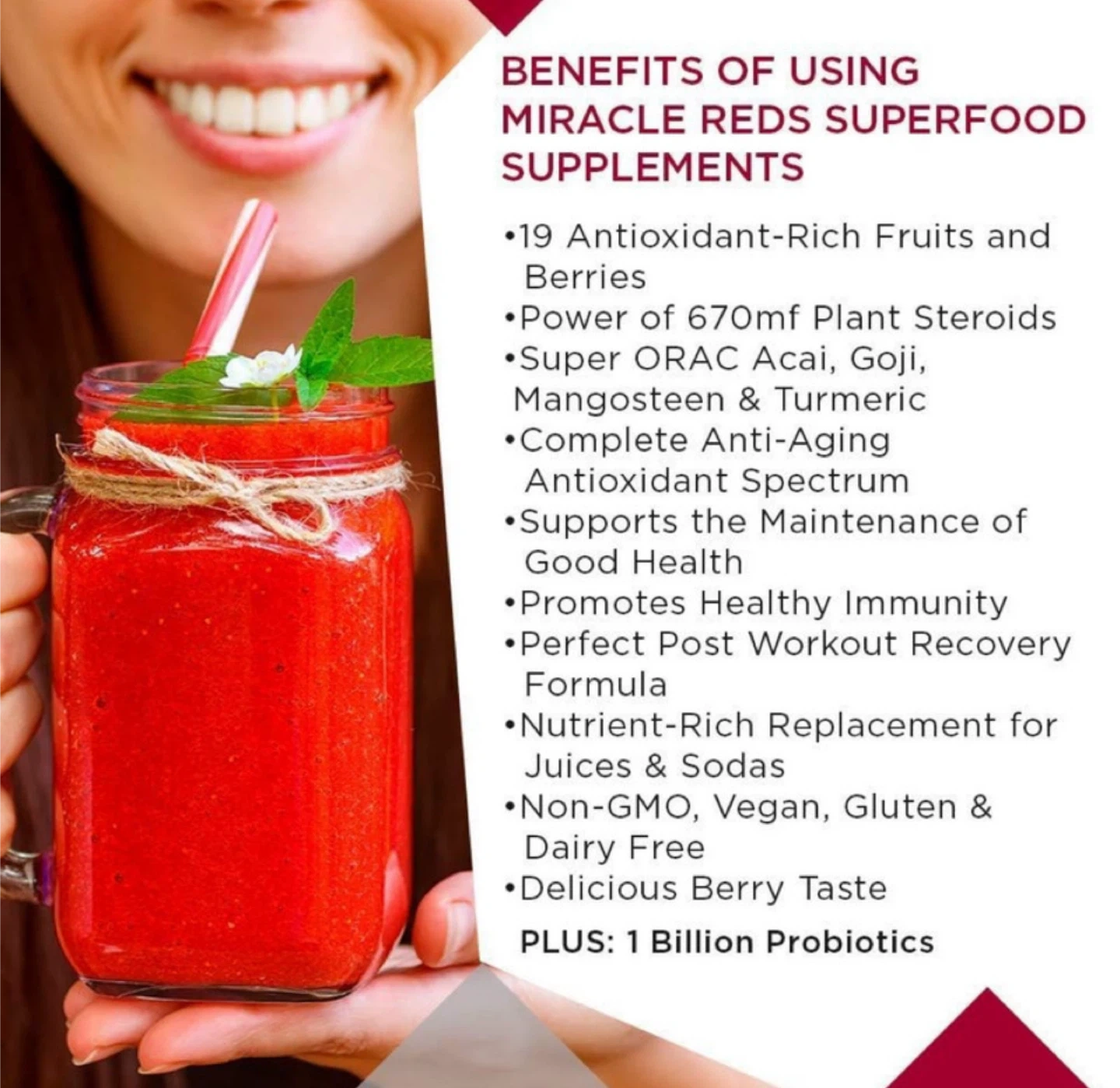 I'm selling MacroLife Naturals Miracle Reds Superfood. It's a superfood and super aliment with 90 servings per container. It contains 19 full spectrum superfruits and berries, offering antioxidants, probiotics, and enzymes. It's also vegan and gluten-free. Enjoy the benefits of plant steroids and a high ORAC source.