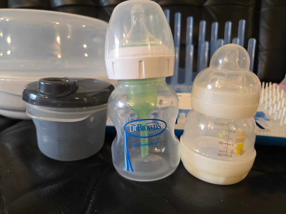 Philips Avent bottle sterilizer $15 Dr Brown's bottle drying rack $10 New Nuk pacifiers $5 Unused Philips Avent formula dispenser $5 Two unused baby bottles $5 $35 for all Can sell separately (prices listed)