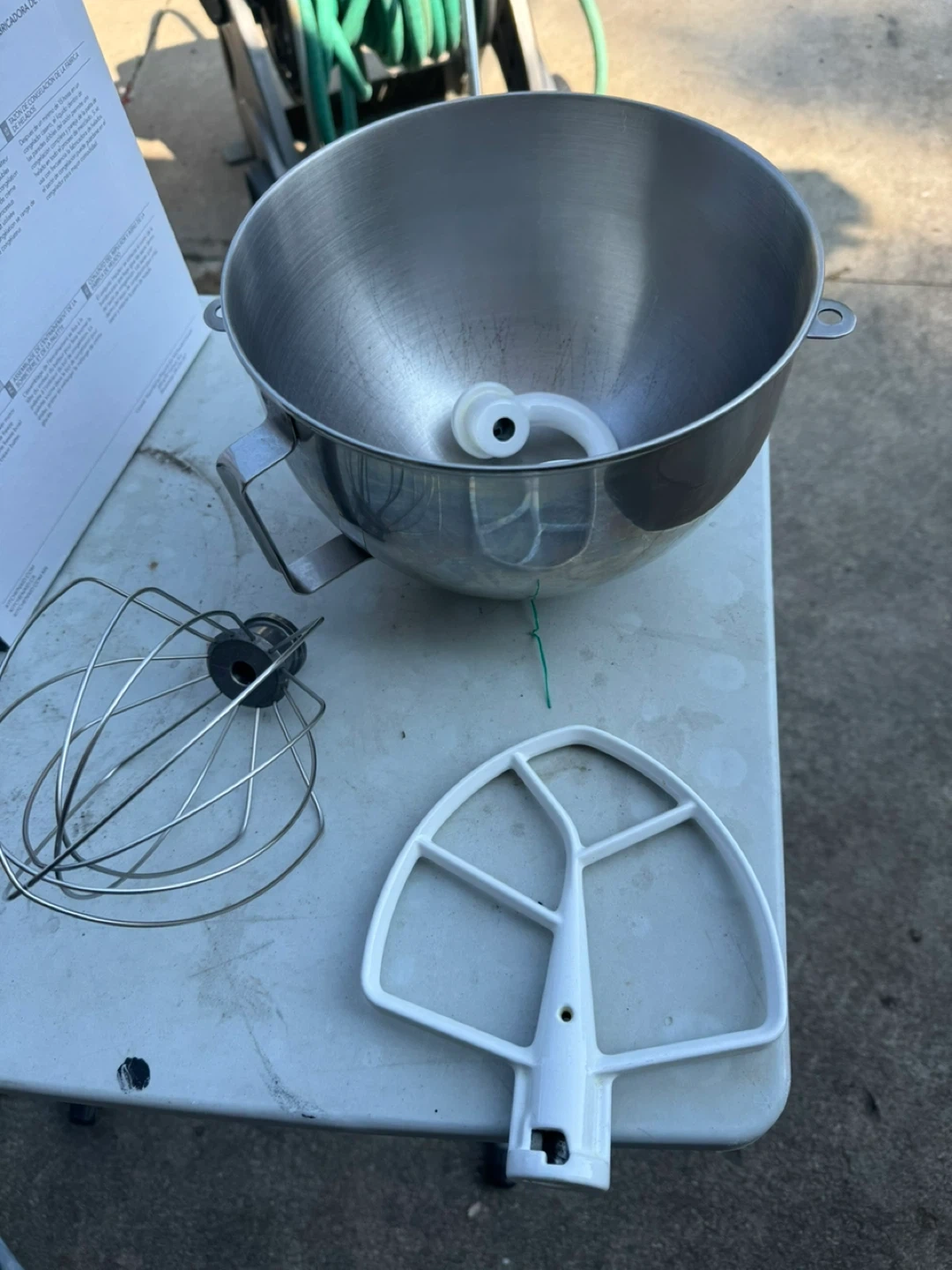Selling a KitchenAid mixer bowl with several attachments. Includes a dough hook, whisk, and flat beater. Great for all your baking needs!