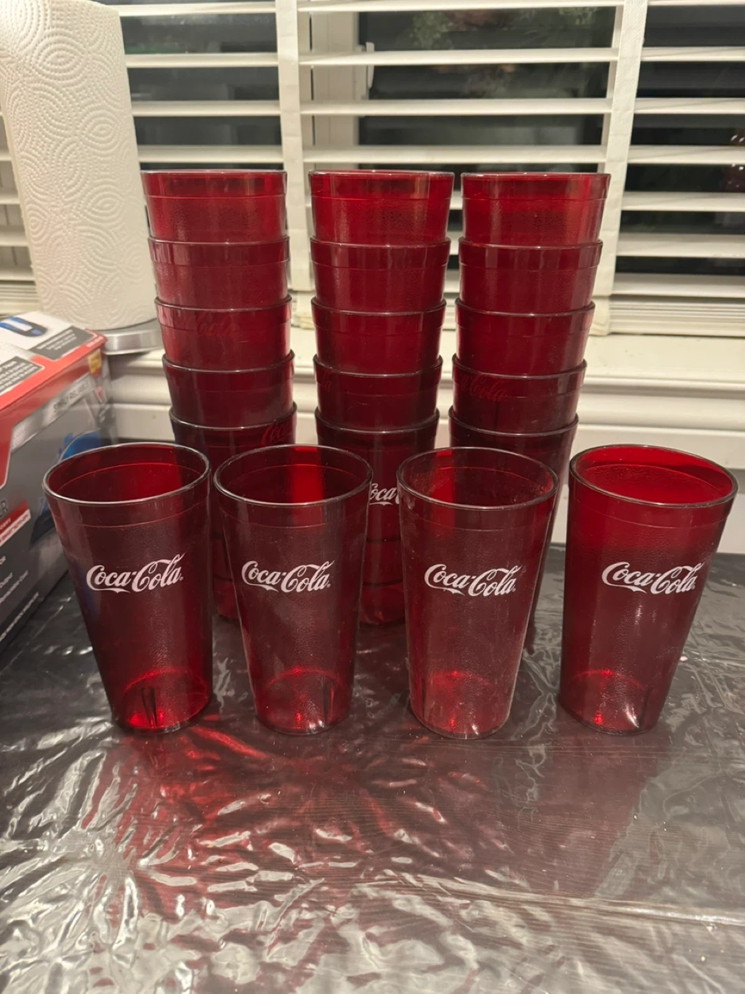 Selling a set of 20 Coca-Cola red plastic cups. They're in great shape and perfect for parties, picnics, or just adding a bit of fun to your everyday drinks!