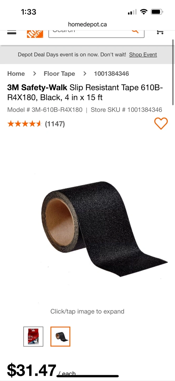 Selling this Slip Resistant Tape About 60 FT 15 FT Retails for $31+ Tax at Home Depot So 60FT at Home Depot will cost around $140 The tape is 4 Inches Wide Pickup Hamilton Mountain Rymal & Upper Gage Message me for delivery inquiries Cash only Checkout my other listings for more great deals!!