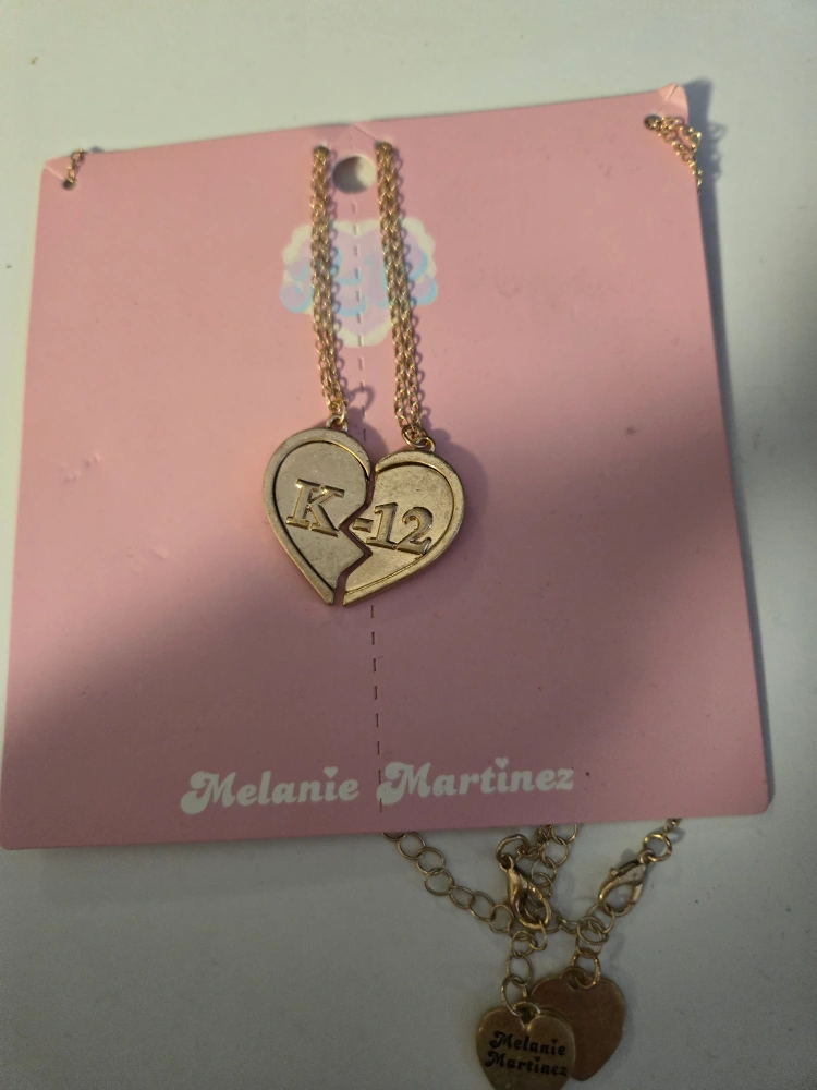 Selling a Melanie Martinez K-12 heart necklace! It's a cute gold-coloured necklace with a heart pendant split in two, featuring the 'K-12' logo. Perfect for any fan!