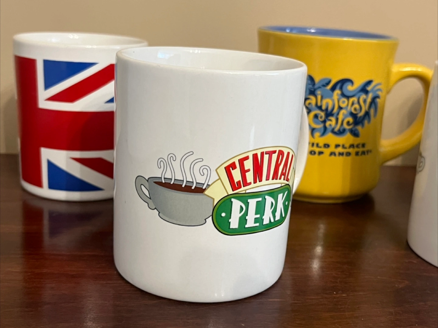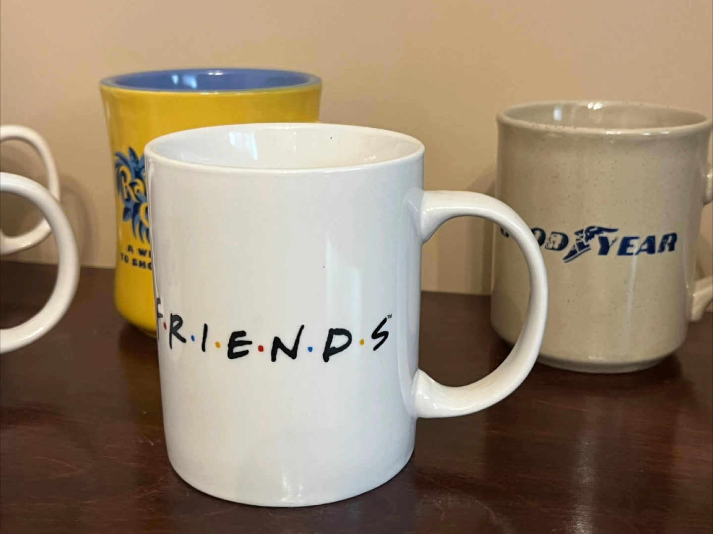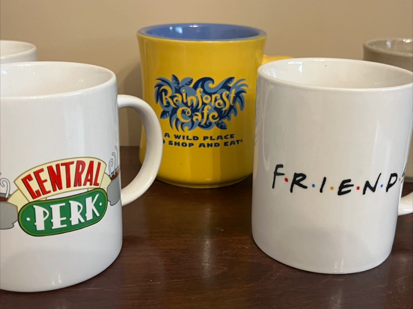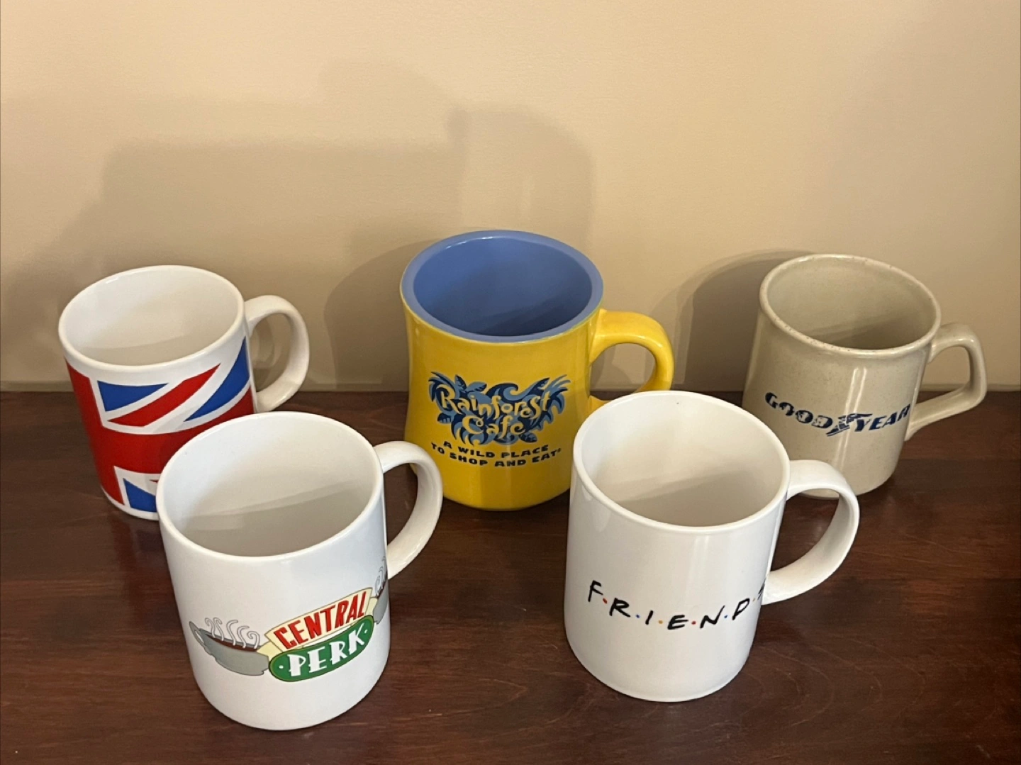 Selling a selection of fun and collectible coffee mugs! There's a Friends mug, a Central Perk mug, a Rainforest Cafe mug, a Goodyear mug, and a Staffordshire British mug.