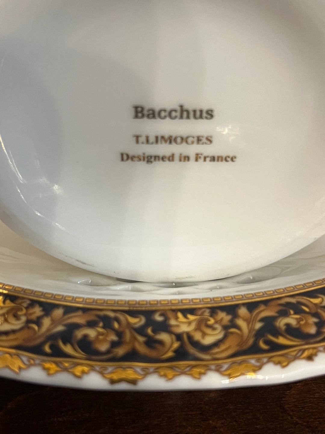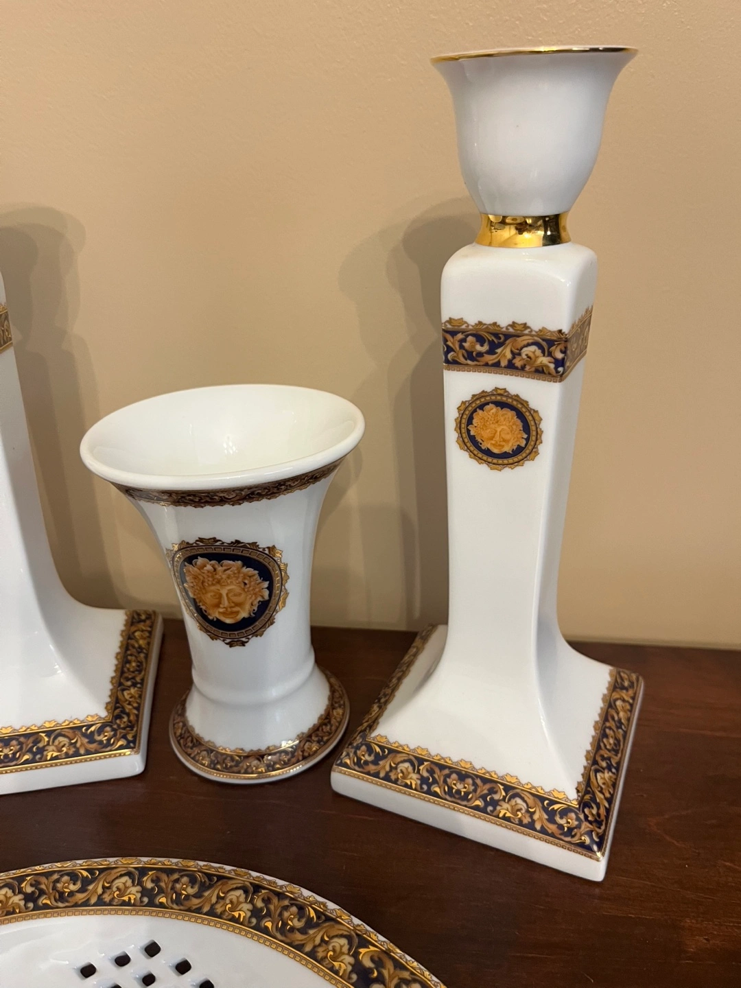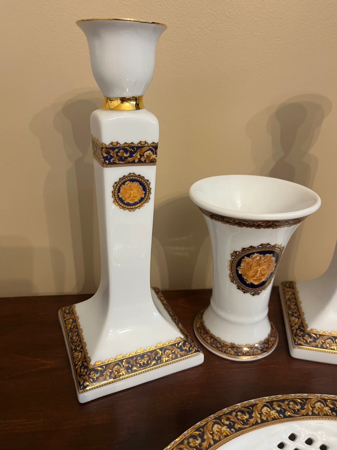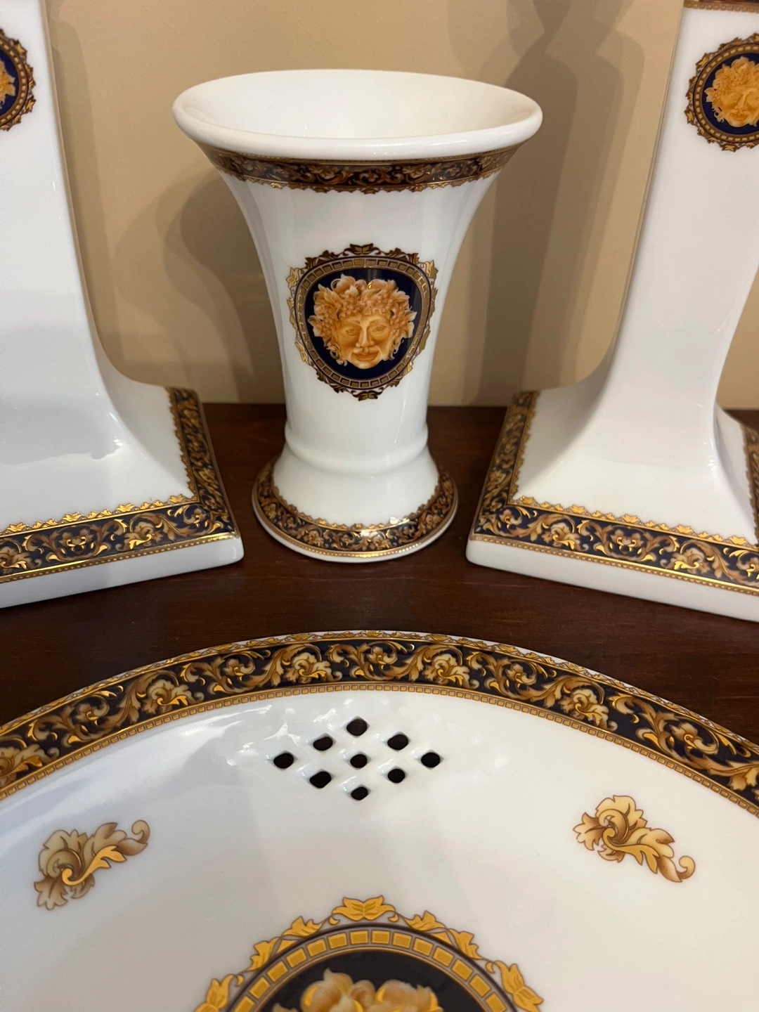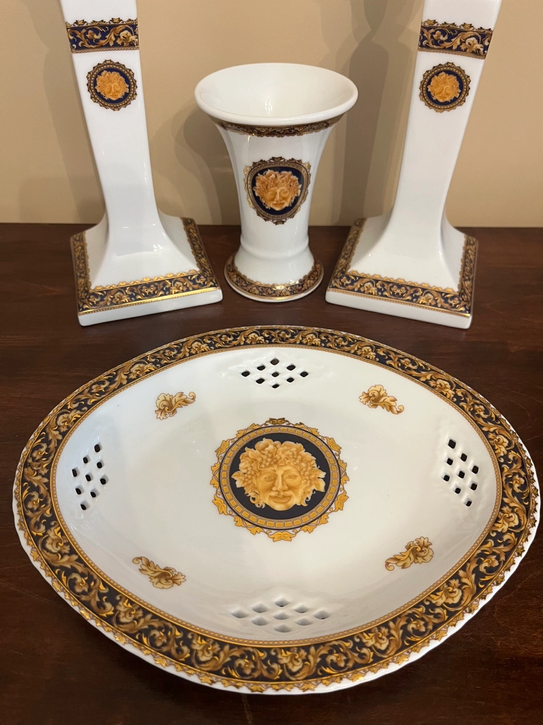 Selling a beautiful porcelain set, including two candlesticks, vase and plate. The set features the iconic design in gold and navy on a white background of this Bacchus T.Limoges. Perfect for adding a touch of luxury to your home decor!