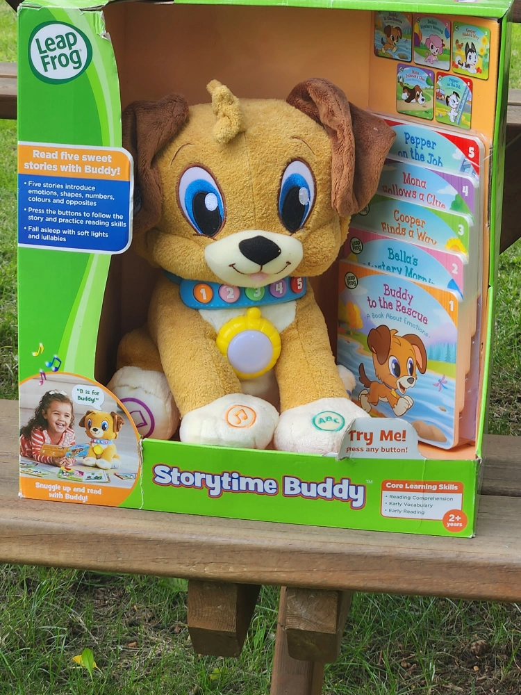 This is a LeapFrog Storytime Buddy! It's an interactive plush toy that reads five sweet stories. It introduces emotions, shapes, numbers, colours, and opposites. Press the buttons to follow the story and practice reading skills. It even has soft lights and lullabies to help your little one fall asleep. It's designed for ages 2+ years and helps with reading comprehension, early vocabulary, and early reading. never been used!