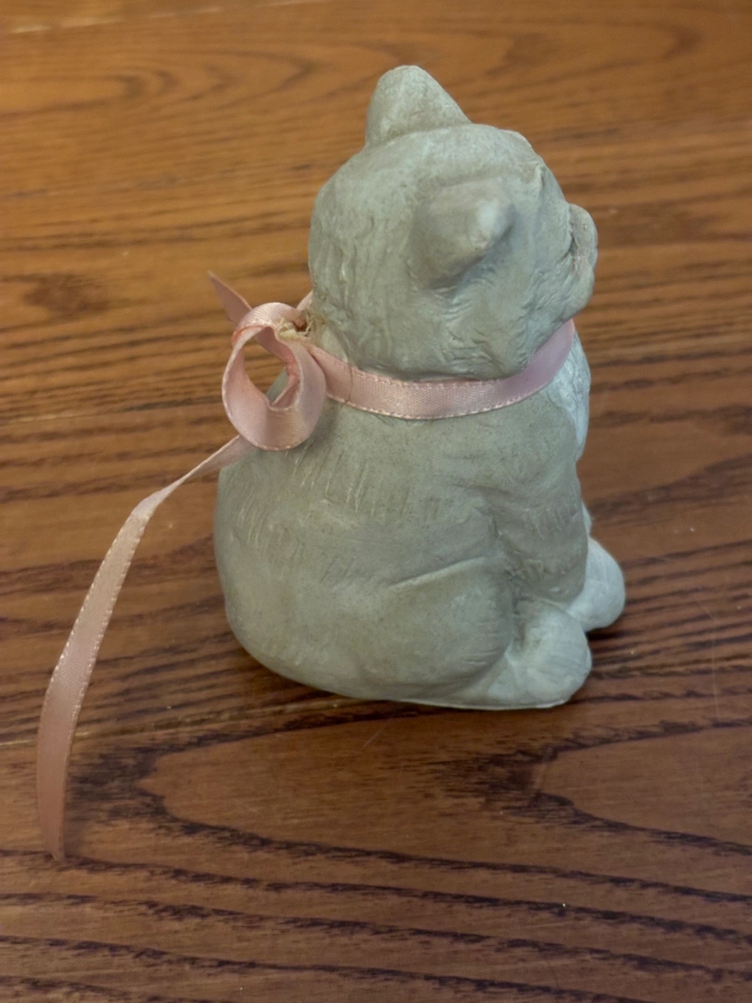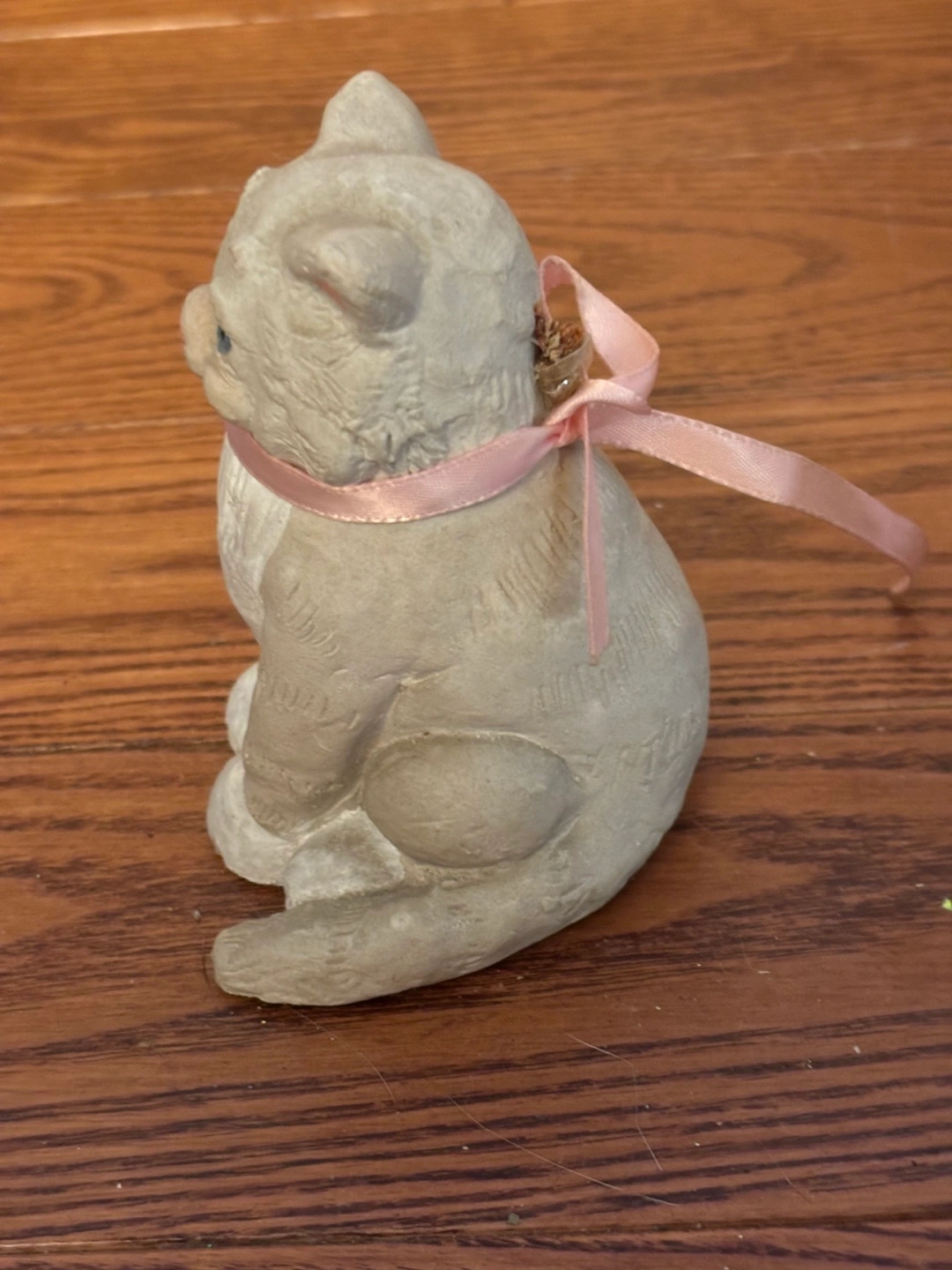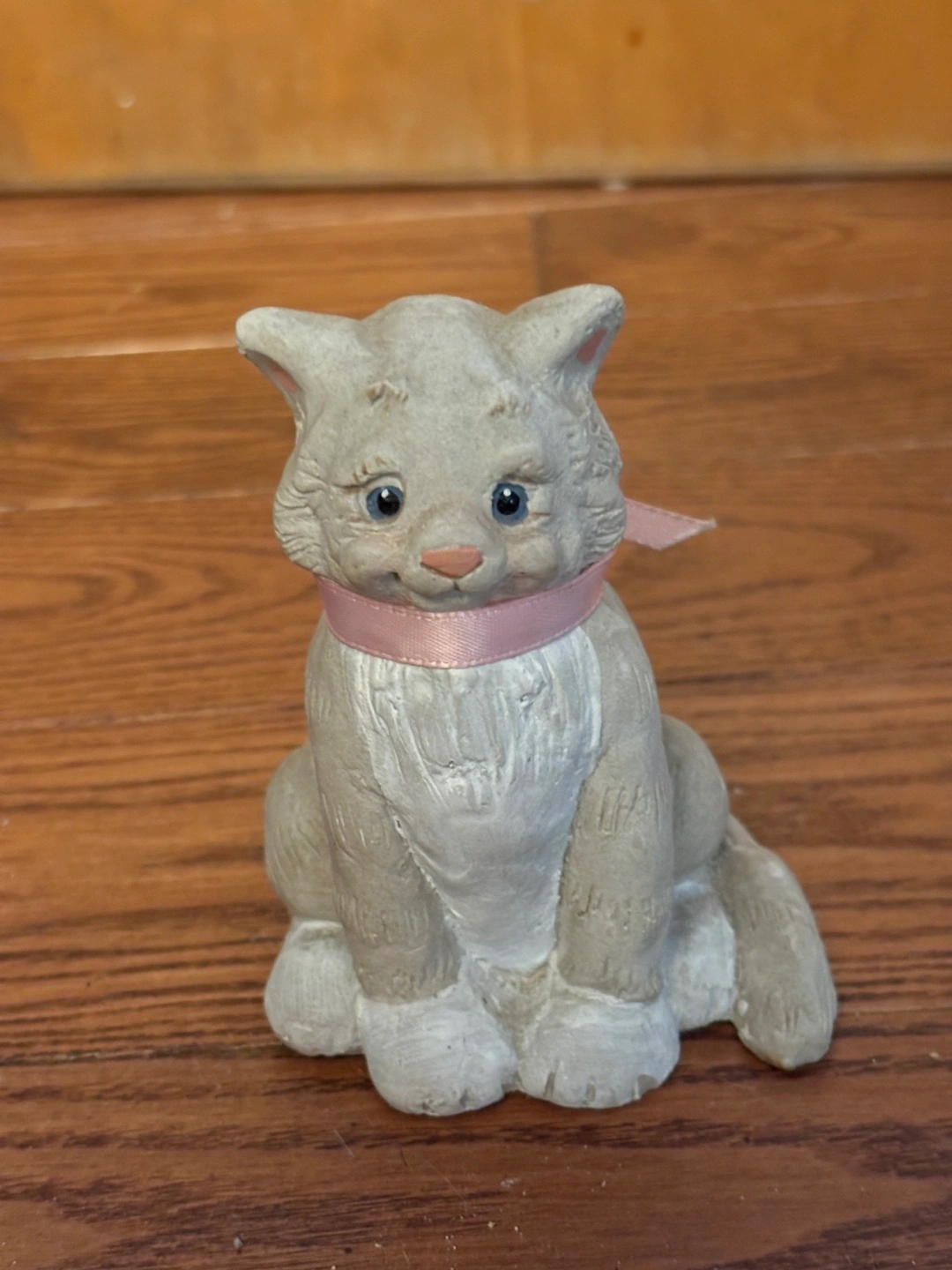 A sweet little cat figurine, perfect for adding a touch of charm to any space! It features a delicate pink ribbon around its neck. A lovely decorative piece in great condition!