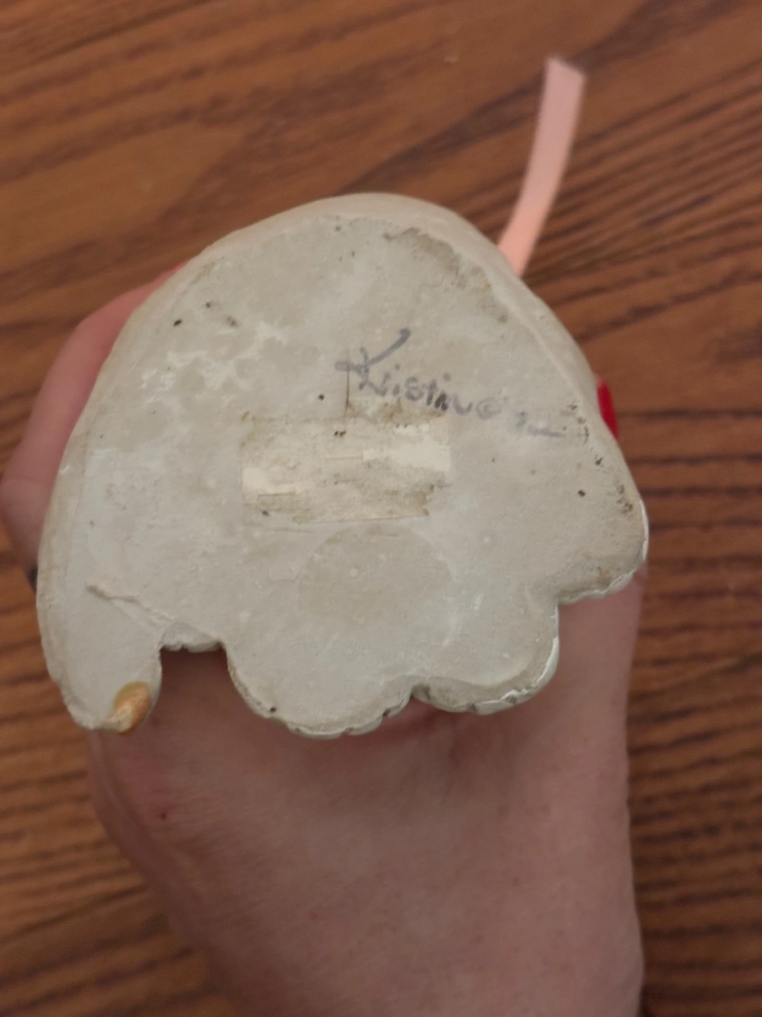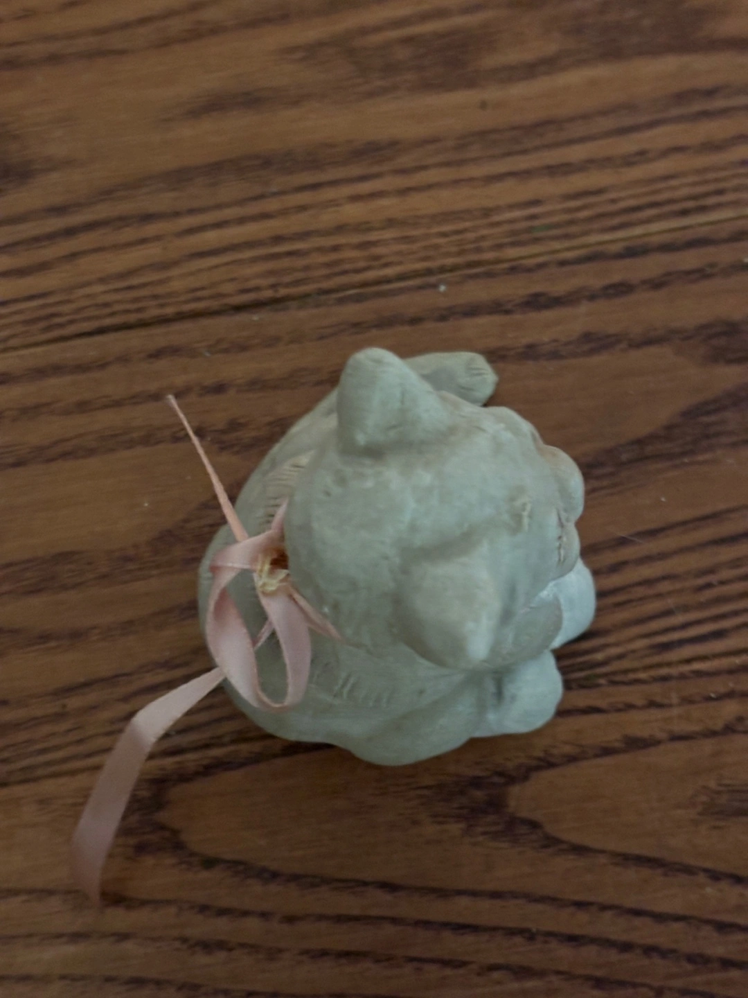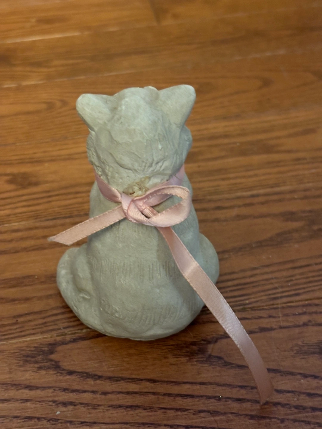 A sweet little cat figurine, perfect for adding a touch of charm to any space! It features a delicate pink ribbon around its neck. A lovely decorative piece in great condition!