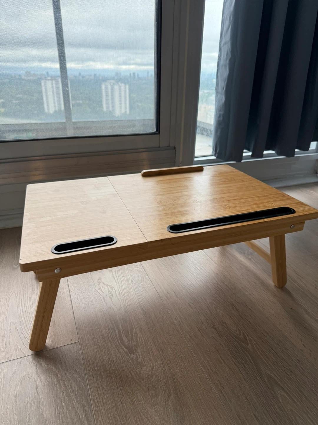 Selling a foldable bed desk in great condition! Perfect for working or enjoying breakfast in bed. It's lightweight and easy to store when not in use. Features include a smooth surface and convenient slots for holding your phone or tablet. This desk is a great addition to any home!