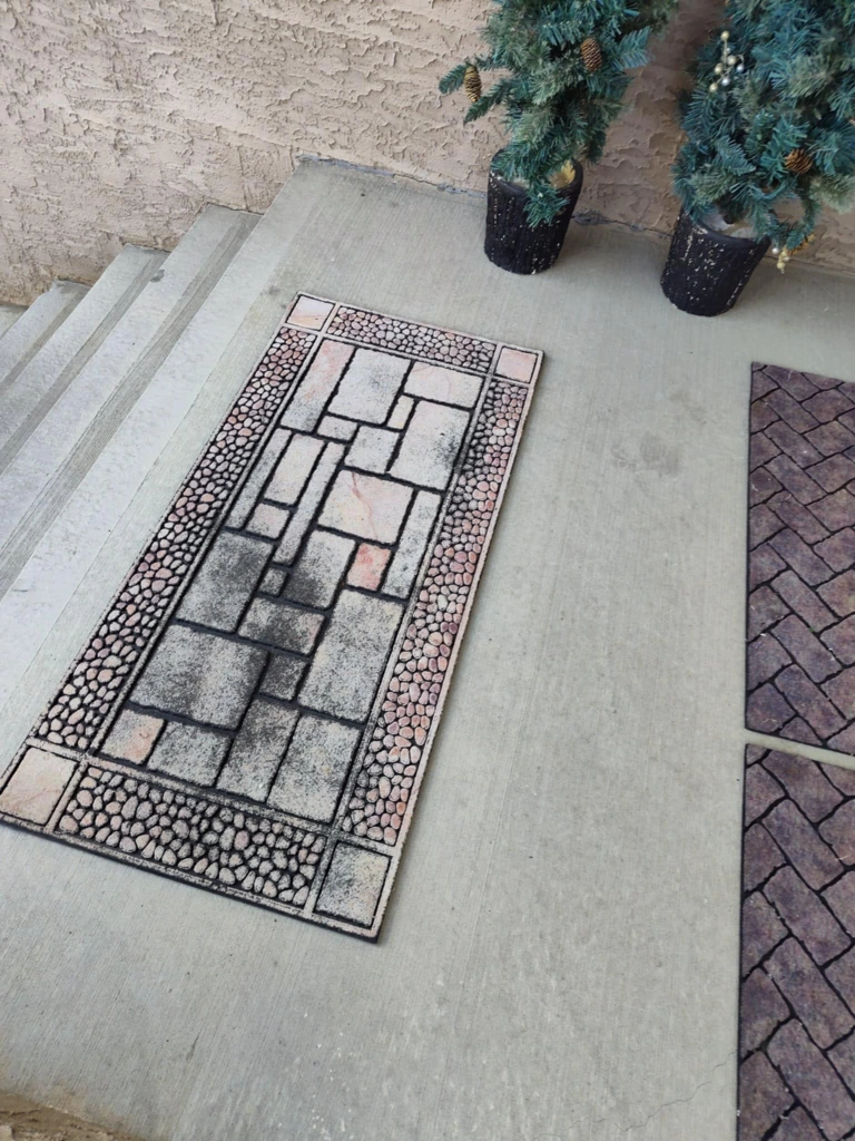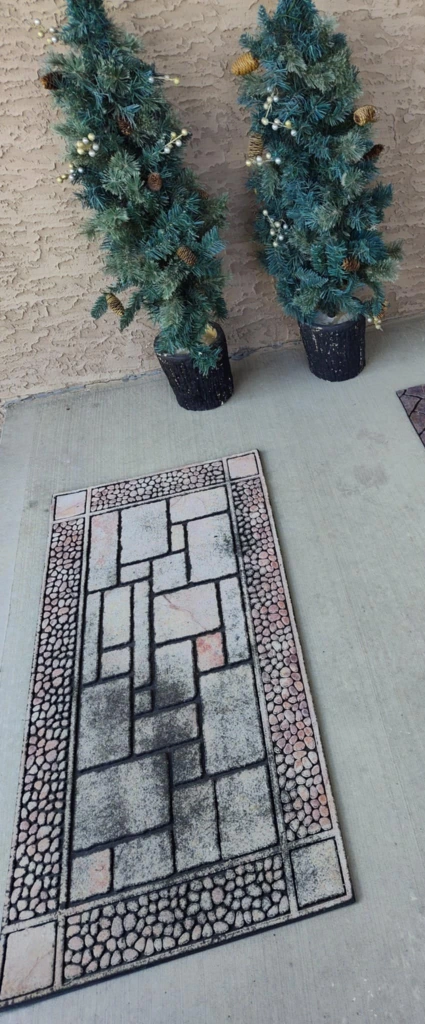 Long 47.5" Height 22.3 " 1 cm thick Heavy duty rubber doormat. It has a stone pattern and is in fair condition.
