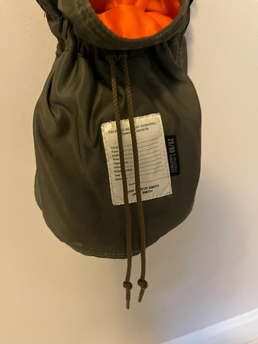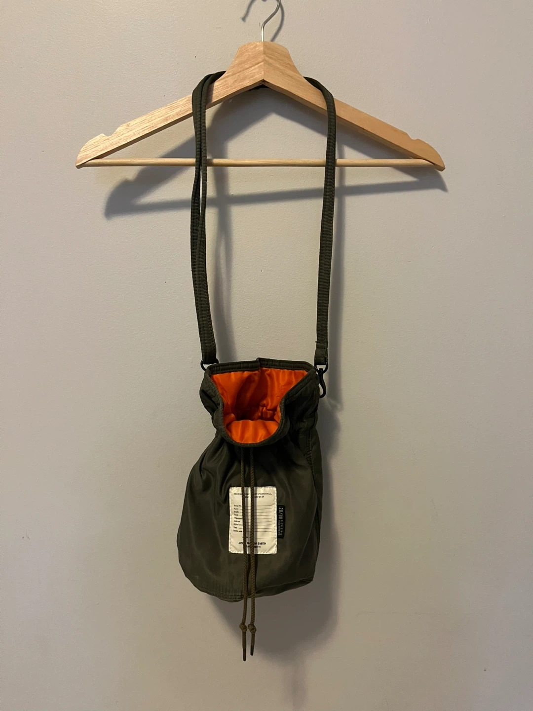This is a stylish 20/80 drawstring shoulder bag in olive green. It's in great condition and ready for a new home! The bag features a unique drawstring closure and a vibrant orange lining. Perfect for carrying your essentials with a touch of understated cool