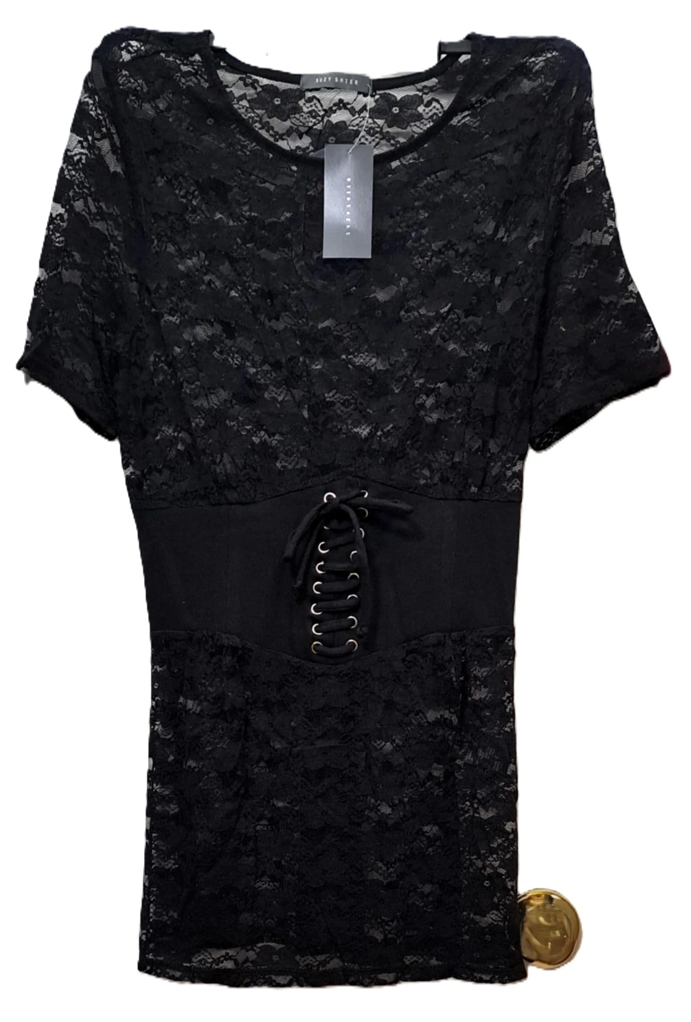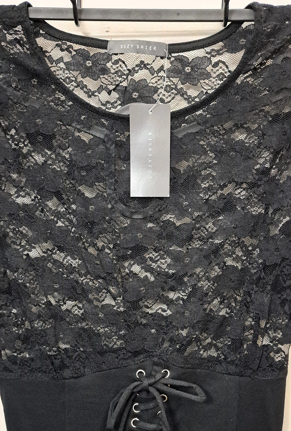 This Suzy Shier lace tummy control stylish, beautiful feminine blouse is both for casual and dressy occasions. It is made of lace with with a focus on shaping the midsection cotton fabric to provide tummy control. For teens and adults.