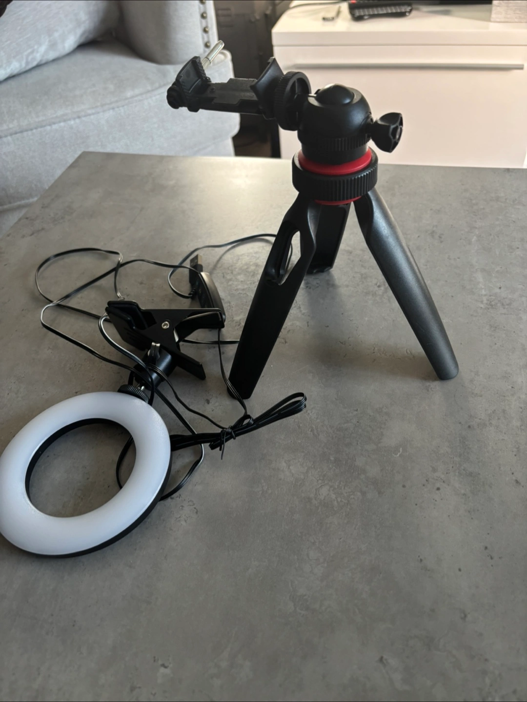 Selling a ring light with a tripod stand. It's perfect for taking photos or videos. Includes a phone clip!