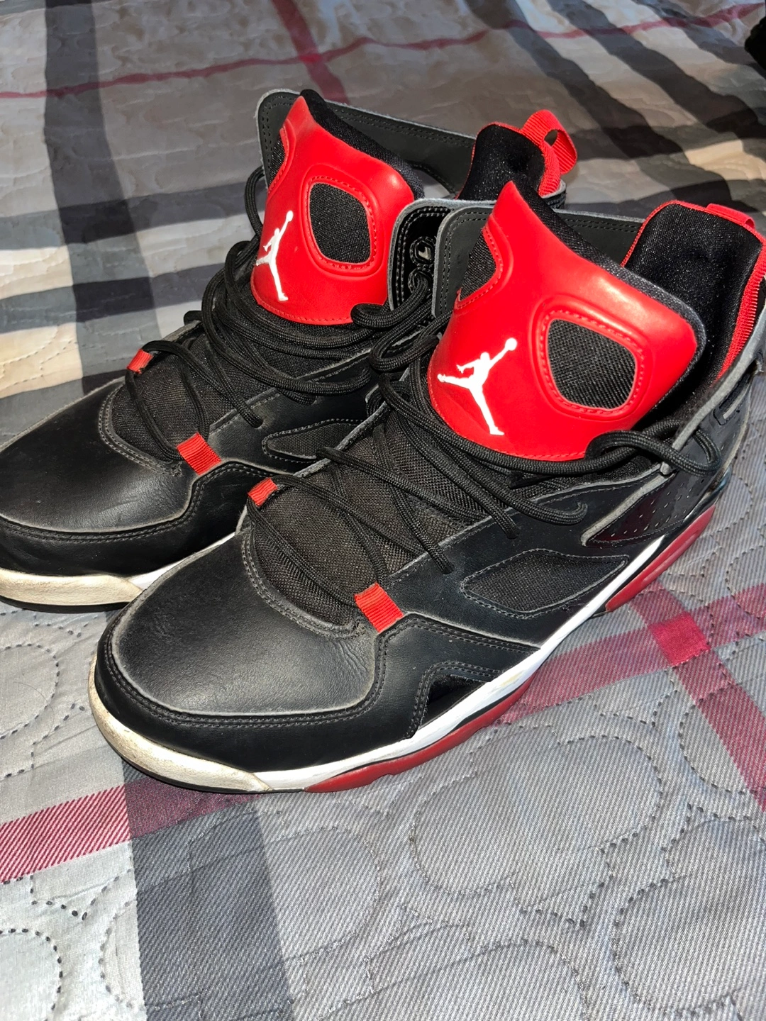 Selling a pair of Jordan Flight 45 high top shoes. They are black and red with the iconic Jumpman logo. Great for basketball or casual wear!