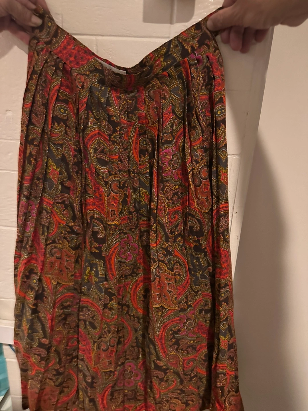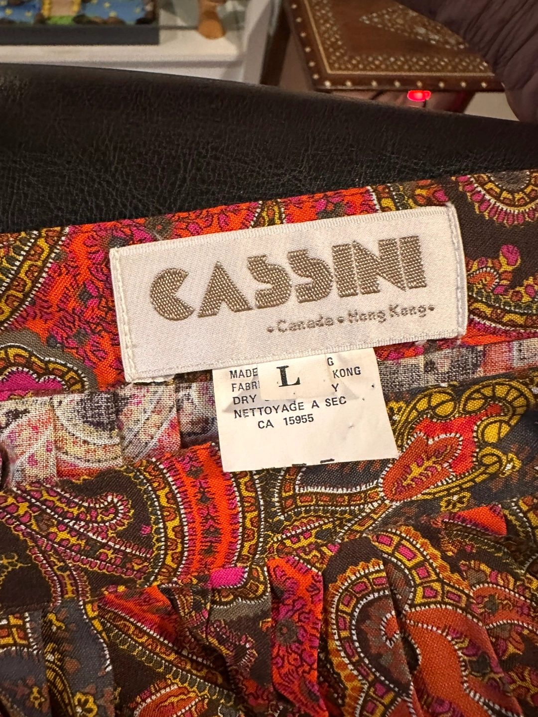 This is a beautiful CASSINI skirt featuring a vibrant paisley print. It's a size L and in great condition. The skirt has a unique and eye-catching pattern, perfect for adding a touch of flair to your wardrobe!