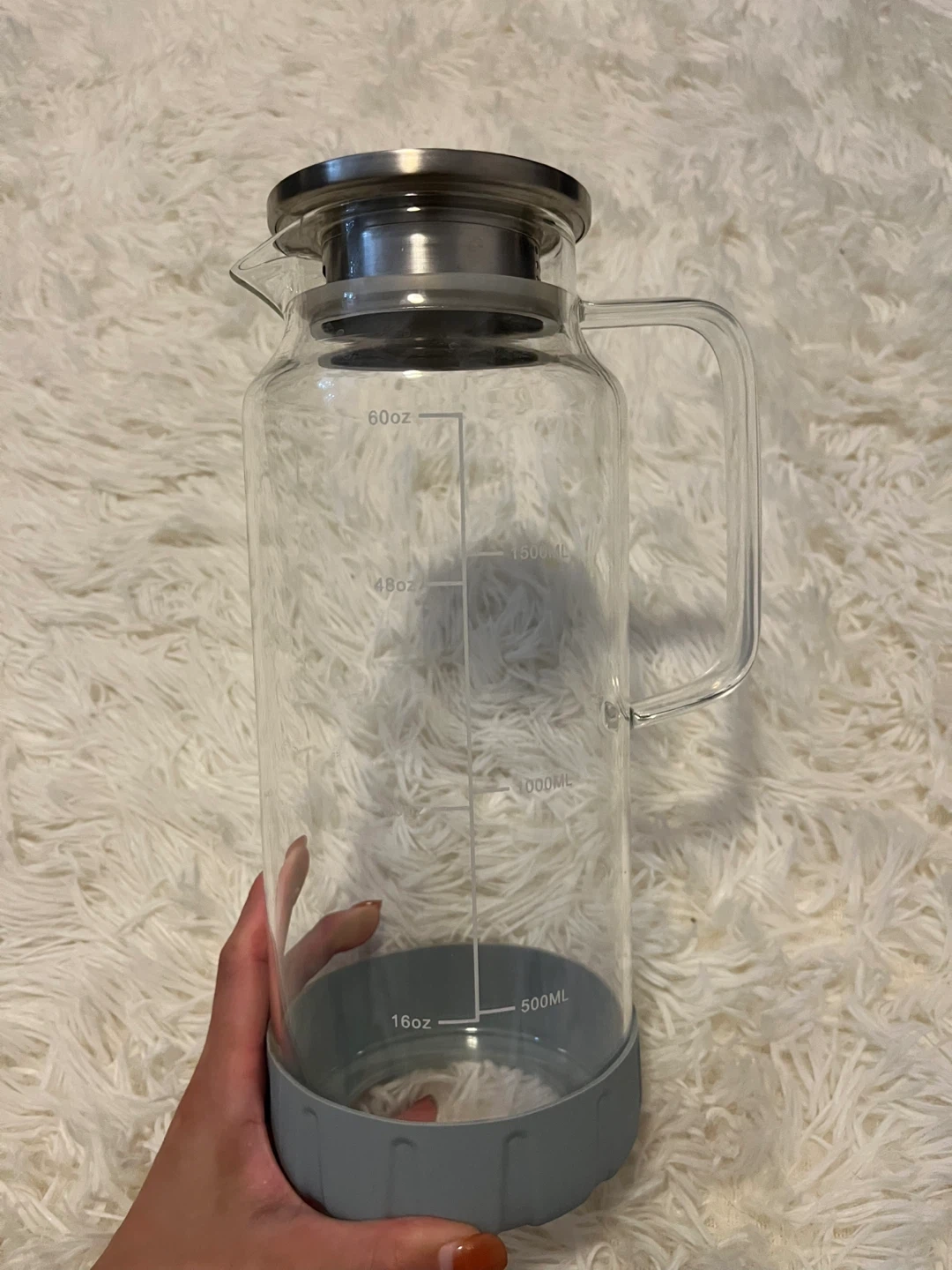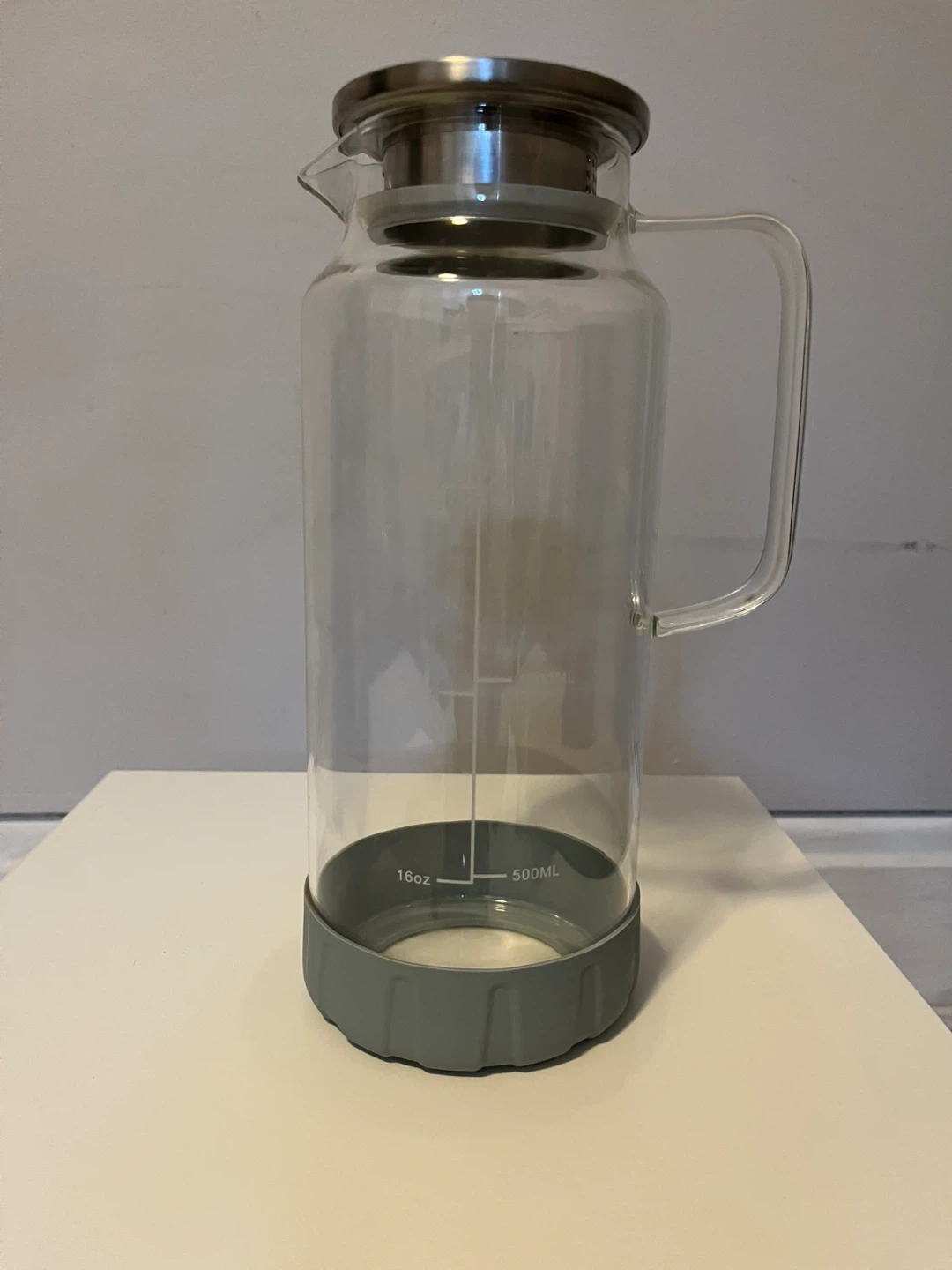 Here's a clear glass pitcher that's perfect for serving up your favourite drinks! It features a sleek design with a grey base and a stainless steel lid. It can hold up to 60oz or 1800ml, making it great for entertaining or everyday use