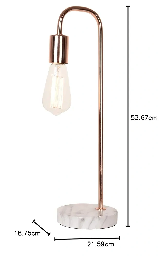 Catalina Lighting 20458-001 Rosie 19-Inch Faux Marble Base, Desk Lamp, Rose Gold Lamp only Retails for $79 + HST on Amazon Finish type: Gold Finish Base material: Faux Marble Product Dimensions: 18.7D x 21.6W x 53.7H Centimetres Item weight: 1.65 Pounds Lamp type: Incandescent, Light Emitting Diode Shade colour: Rose Gold SLEEK AND CHIC: This minimalist inspired table lamp features a sturdy metal body with rose gold finish and white faux marble base. A vintage inspired Edison bulb is recommended (not included) making this piece the perfect addition to your living room, family room, bedroom, dorm room, home office, craft room, kitchen or any open concept living space. Great for apartment living or DIY home remodeling projects and suits a variety of styles including modern, transitional, contemporary, industrial, global, farmhouse, rustic and traditional decor. PRODUCT SPECS: Assembled dimensions 5.5" L x 6.25" L x 19"H. Convenient on/off switch and clear 60" power cord. Each uses (1) Type A 60-watt incandescent or LED equivalent bulb (not included). For indoor use only. Not for use in California. SIMPLE AND QUICK ASSEMBLY: Easy-to-follow instructions in English, Spanish and French. No additional tools or parts required. Please feel free to contact us directly if you need any assistance. SMART HOME COMPATIBLE: This item can also be set up using a smart outlet or smart switch (sold separately) to easily connect to Alexa, Google Home or any other smart home device. SATISFACTION GUARANTEED: We stand behind our products and our customers are our number one priority. We offer a 1-year warranty for all Catalina Lighting products and encourage you to contact us directly if you ever have an issue.
