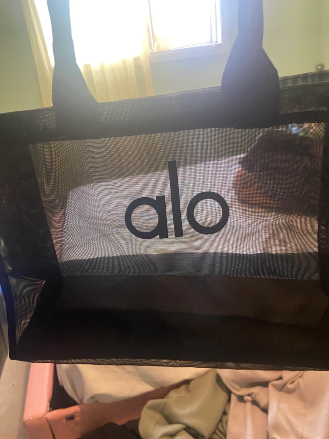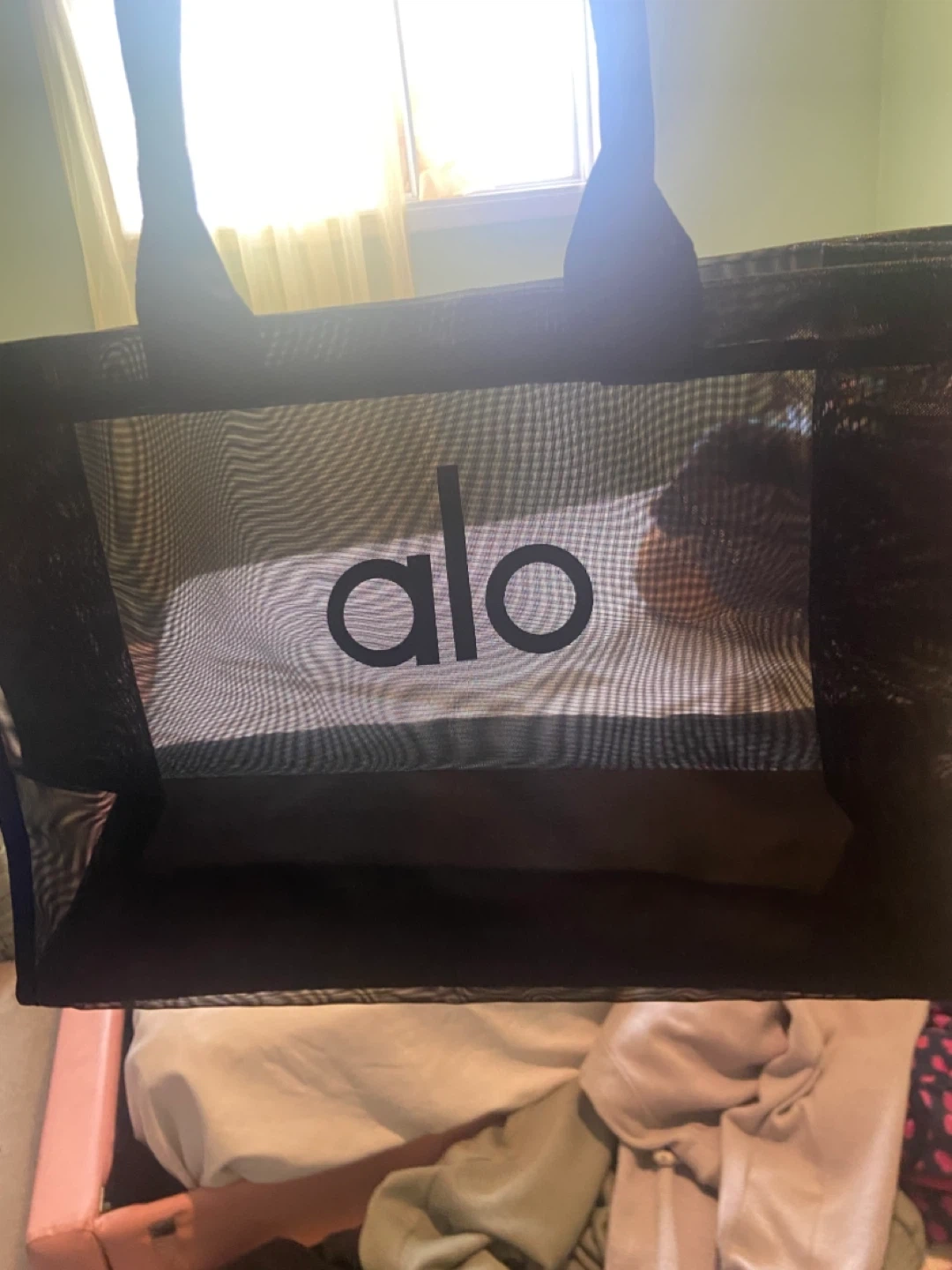 Selling a black sheer alo tote ! New and perfect for carrying your essentials to yoga class or just around town. The bag features the Alo logo prominently on the front. It's lightweight and durable, making it a practical and stylish choice
