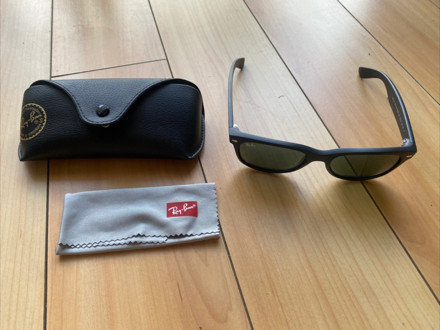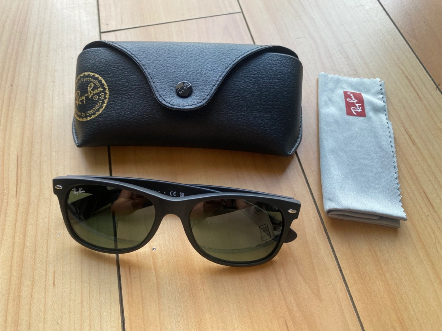 Selling a pair of Ray-Ban New Wayfarer sunglasses in rubber black! They are new and come with the original case and cleaning cloth. - Brand: Ray-Ban - Model: ORB2132 - Colour: Rubber Black