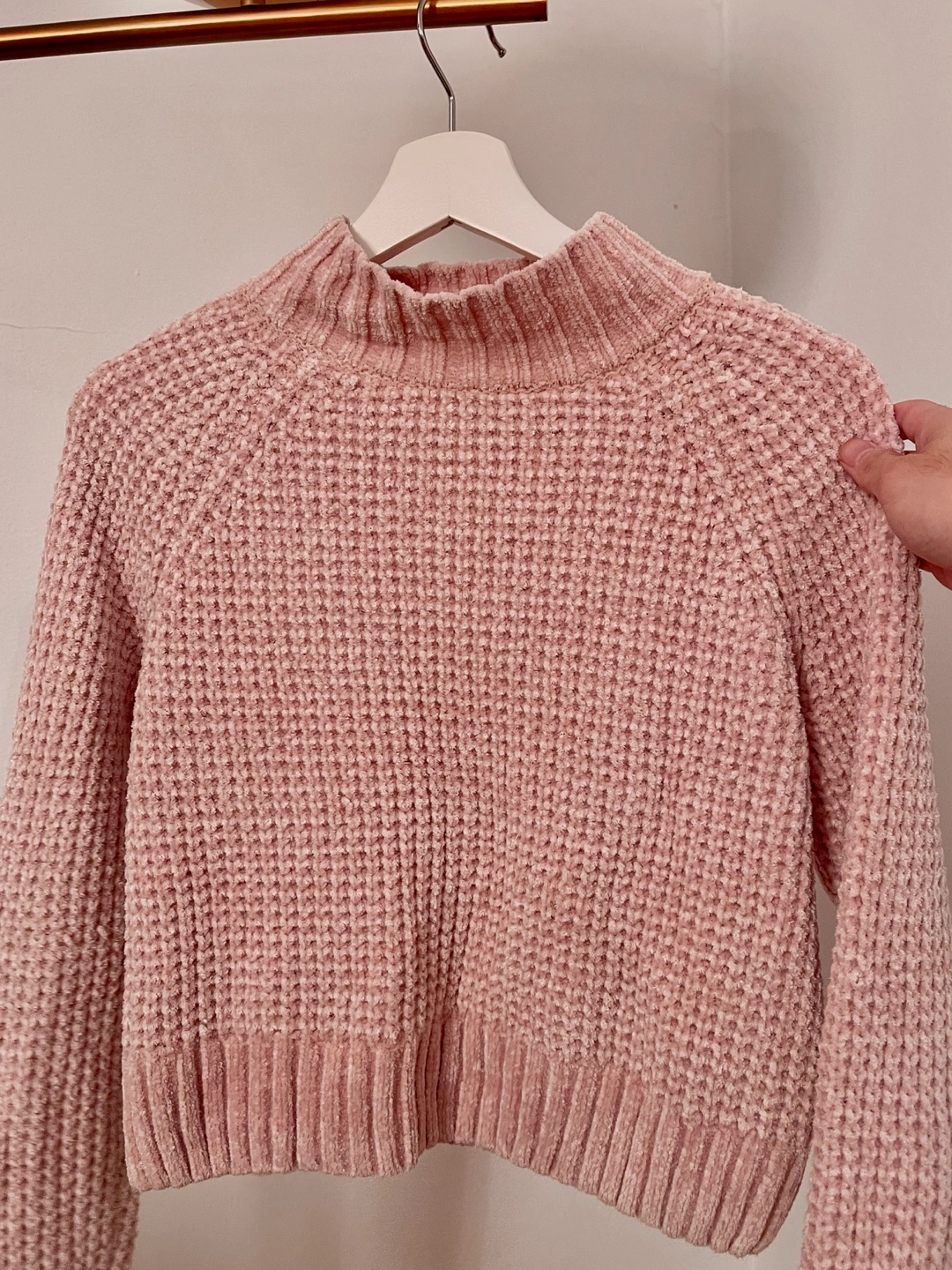 A cozy pink knit sweater, perfect for layering! It's in great condition and ready for a new home. The material is soft and comfortable, making it ideal for cooler weather.