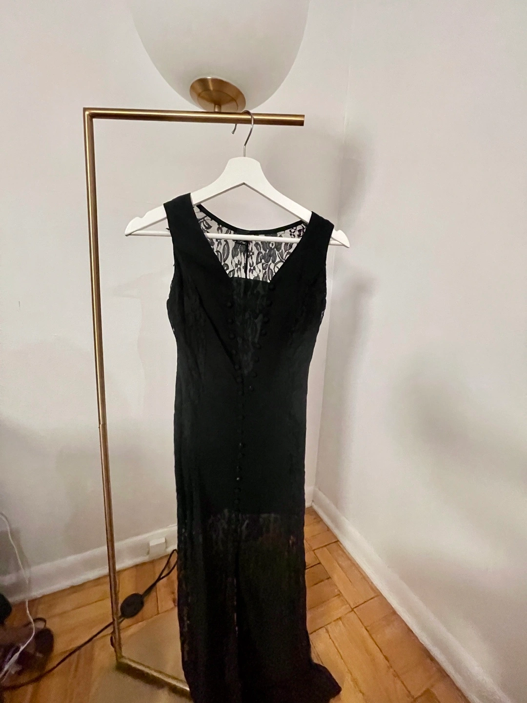 Selling a lovely black dress with lace detailing! It features a V-neck and button detailing down the front. The dress is in great condition and ready for a new home.