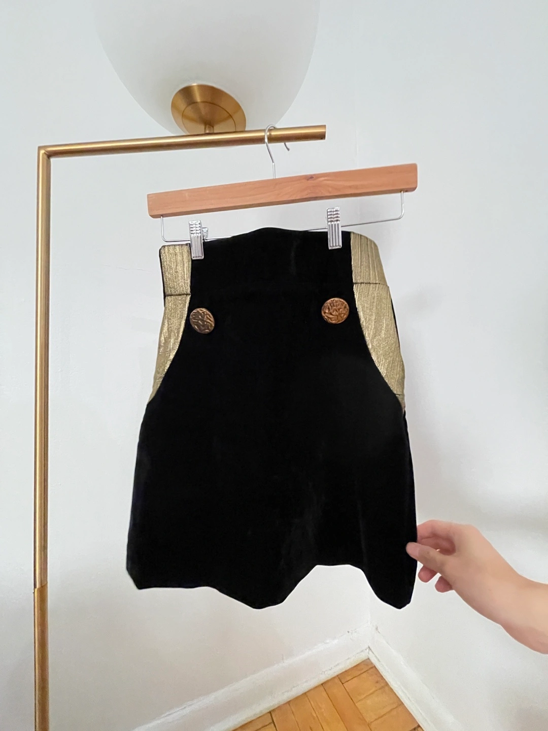 Selling a stylish black velvet mini skirt! It features a gold zipper in the back and gold detailing on the sides with decorative buttons. Perfect for a night out or a chic daytime look!