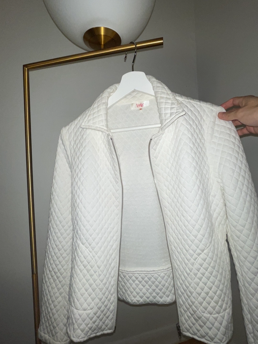 Selling a Veeko white quilted jacket. It's in great condition and ready for a new home! The quilted design adds a touch of texture and style, perfect for layering or wearing on its own. It's a versatile piece that can be dressed up or down for any occasion.