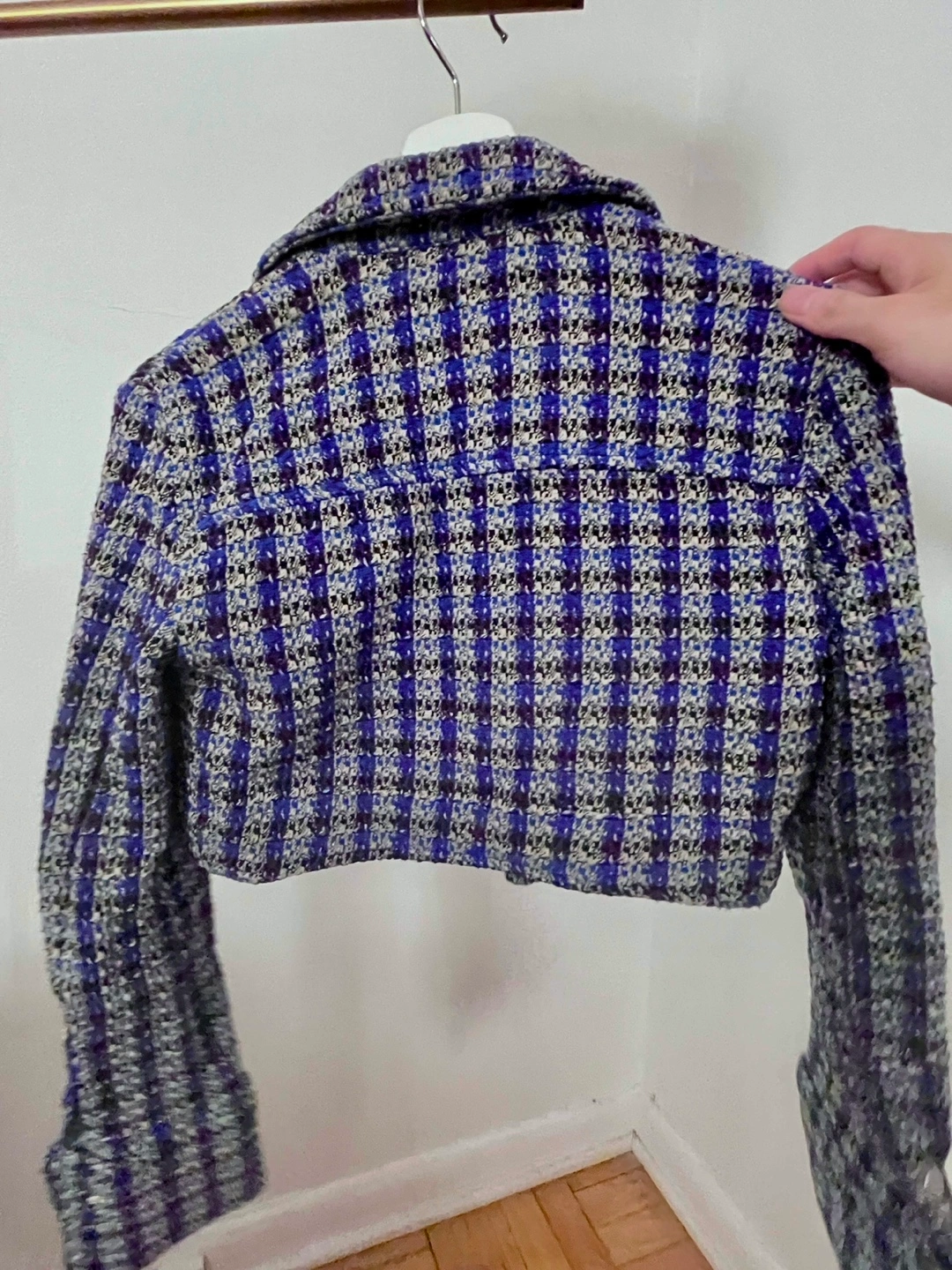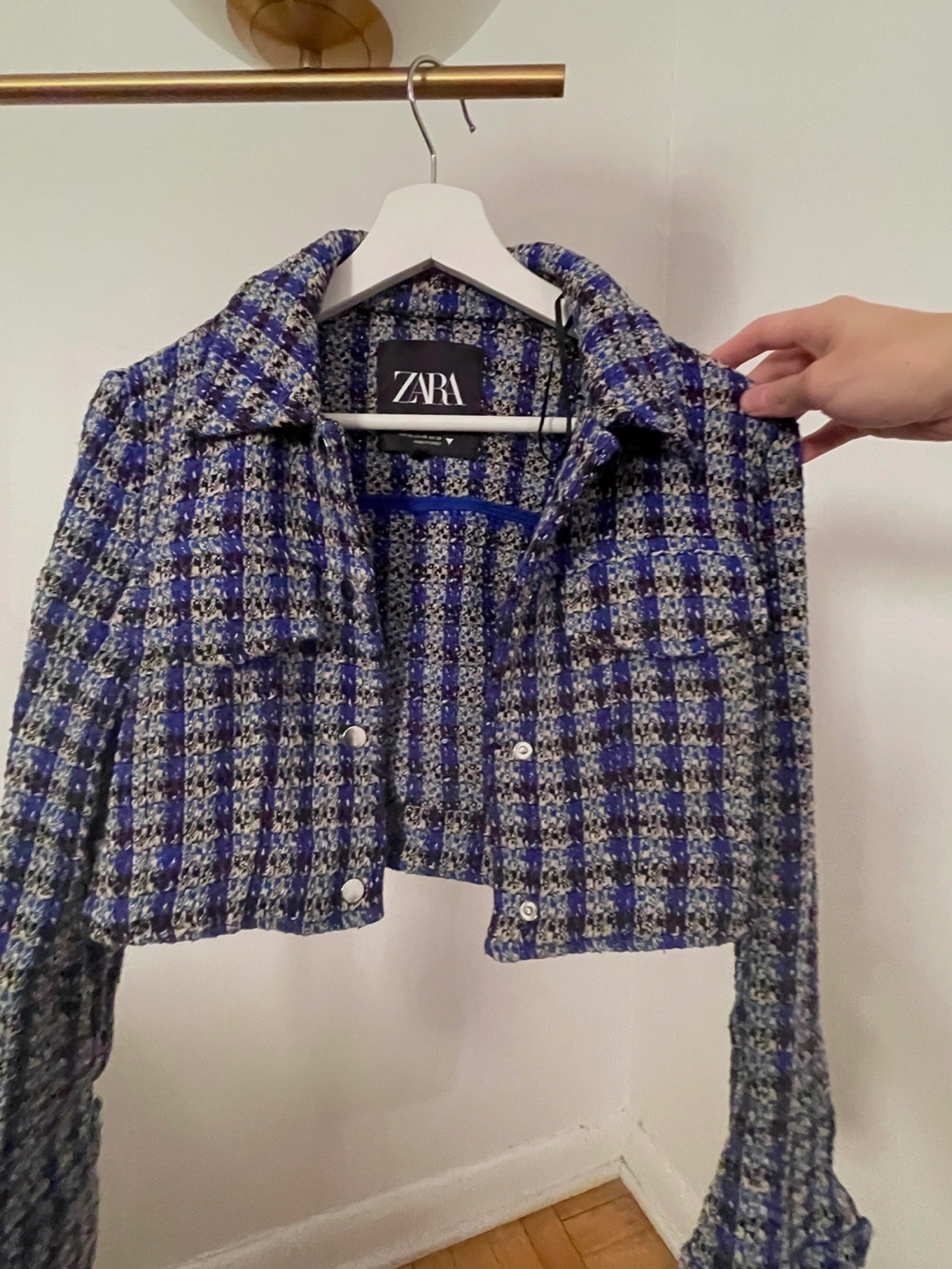 Selling a cute Zara cropped jacket in a blue tweed pattern! It's a size small and in great condition. Perfect for adding a bit of style to any outfit!