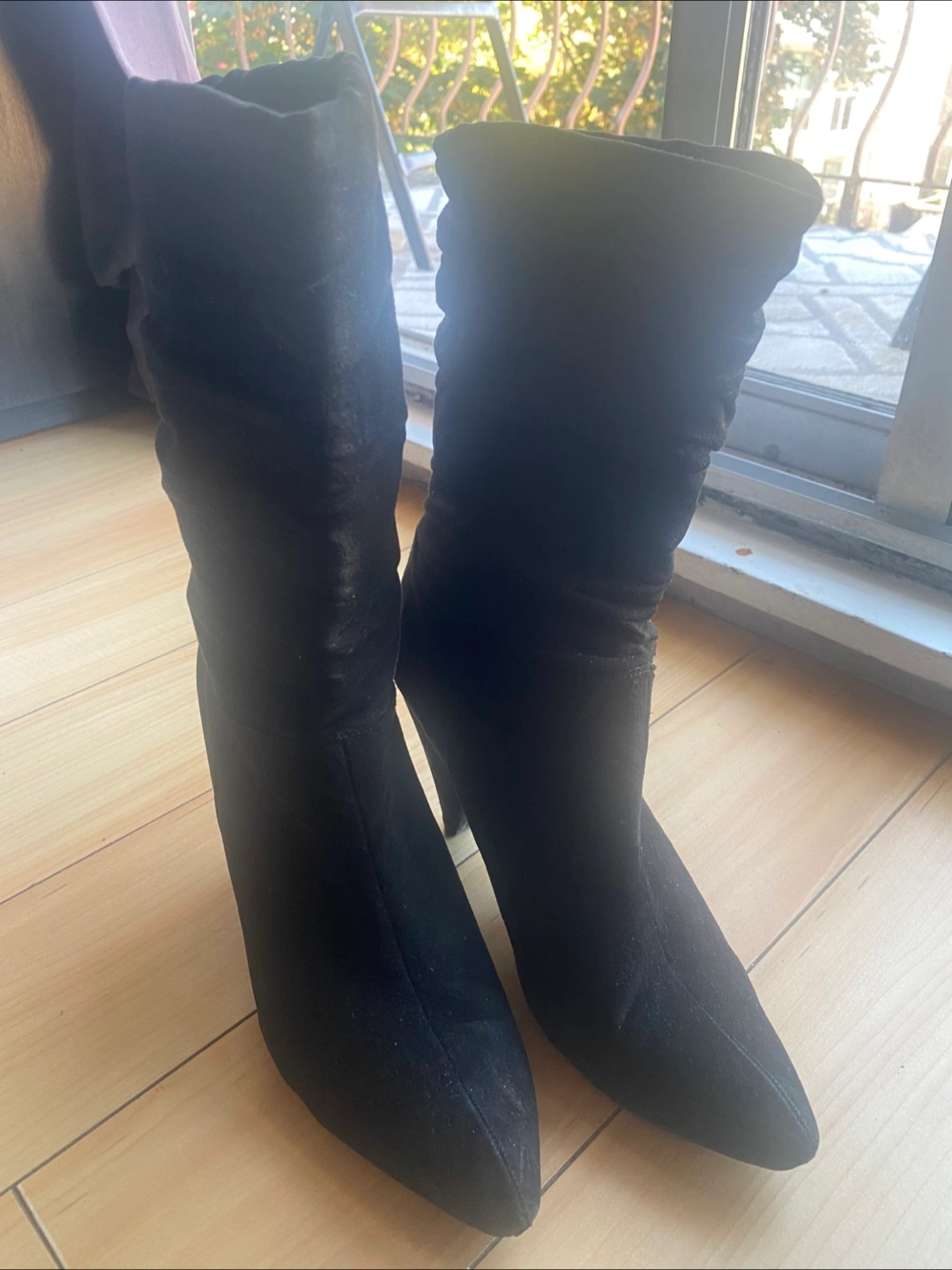 Selling a pair of black suede boots in size 8.5. They're in great condition and ready for a new home. Perfect for adding a touch of style to any outfit!