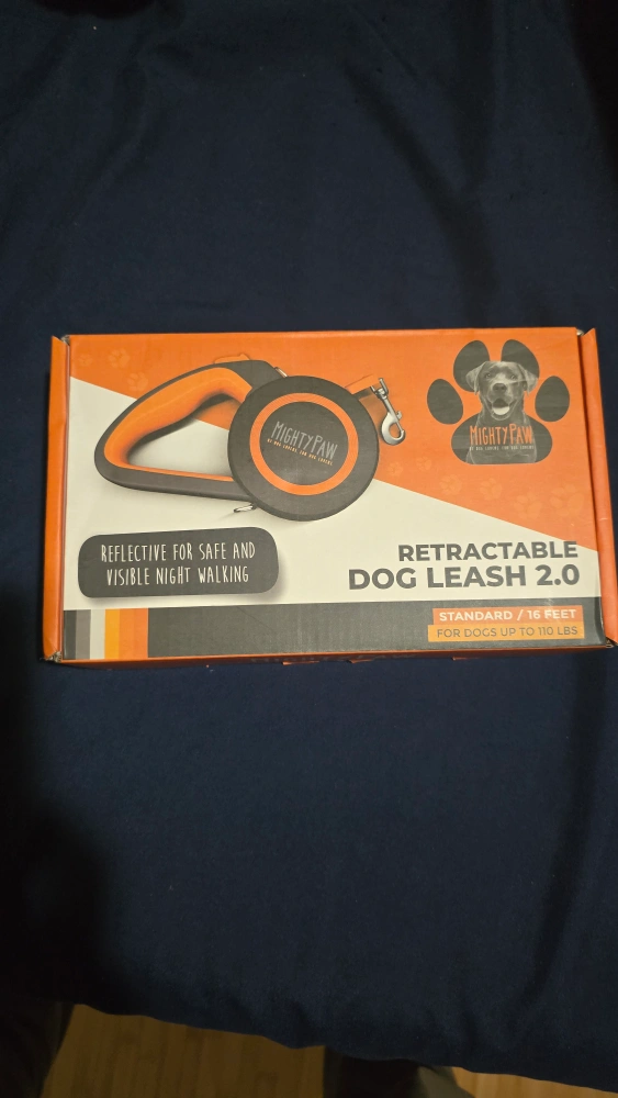 I'm selling a Mighty Paw Retractable Dog Leash 2.0! This leash is perfect for safe and visible night walking. It's designed for dogs up to 110 lbs and extends to 16 feet. The box is included!