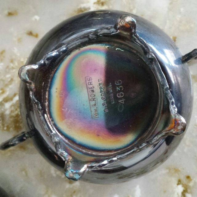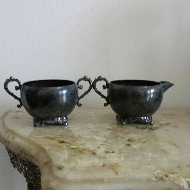 Elegant vintage WM A Rogers silverplate sugar and creamer set and marked 4636. Both pieces are made of silver plated copper (S.P. Copper), giving them a classic, timeless appeal with a warm patina that adds to their antique charm. Matching Set: Includes both sugar bowl and creamer Pattern/Marking: WM A Rogers, #4636 Material: Silverplate over copper Style: Ornate handles and decorative feet Condition: Vintage patina and some tarnish consistent with age (can be polished if preferred). No major dents. Perfect for collectors of Rogers silverplate, vintage kitchen décor, or those looking to add a touch of old-world charm to tea and coffee service.