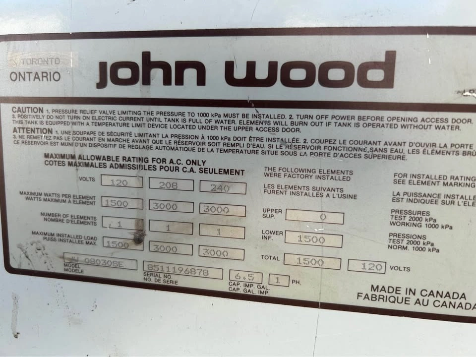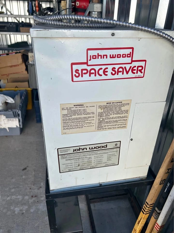John Wood model OB030SE, made in Canada. • 30 Imperial gallon capacity (≈36 US gallons / 136L) • 120V, 1500W lower element • Compact design, great for cabins, trailers, shops, or work camp setups • Good condition, stored indoors Price: $150 OBO Located in SE Calgary, Deerfoot trail & Peigan trail. Pickup only. Untested as it is in storage but works as described by the previous owner.