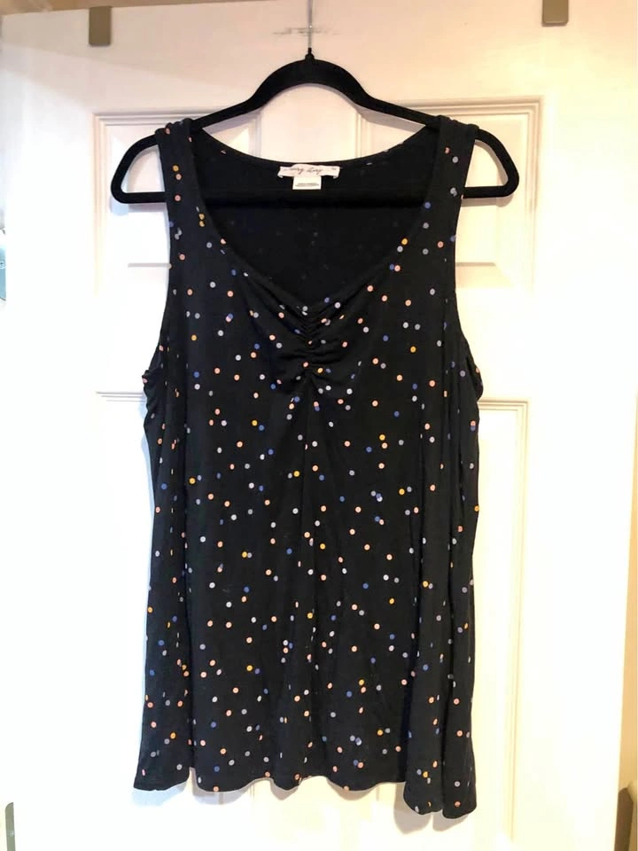 This tank top is soft and comfortable! It doesn’t fit me right or I’d keep it. It has colourful polka dots, but they aren’t in-your-face about themselves. The size tag appears to be removed, but my guess is 1X. Cash only please. Crossposted.
