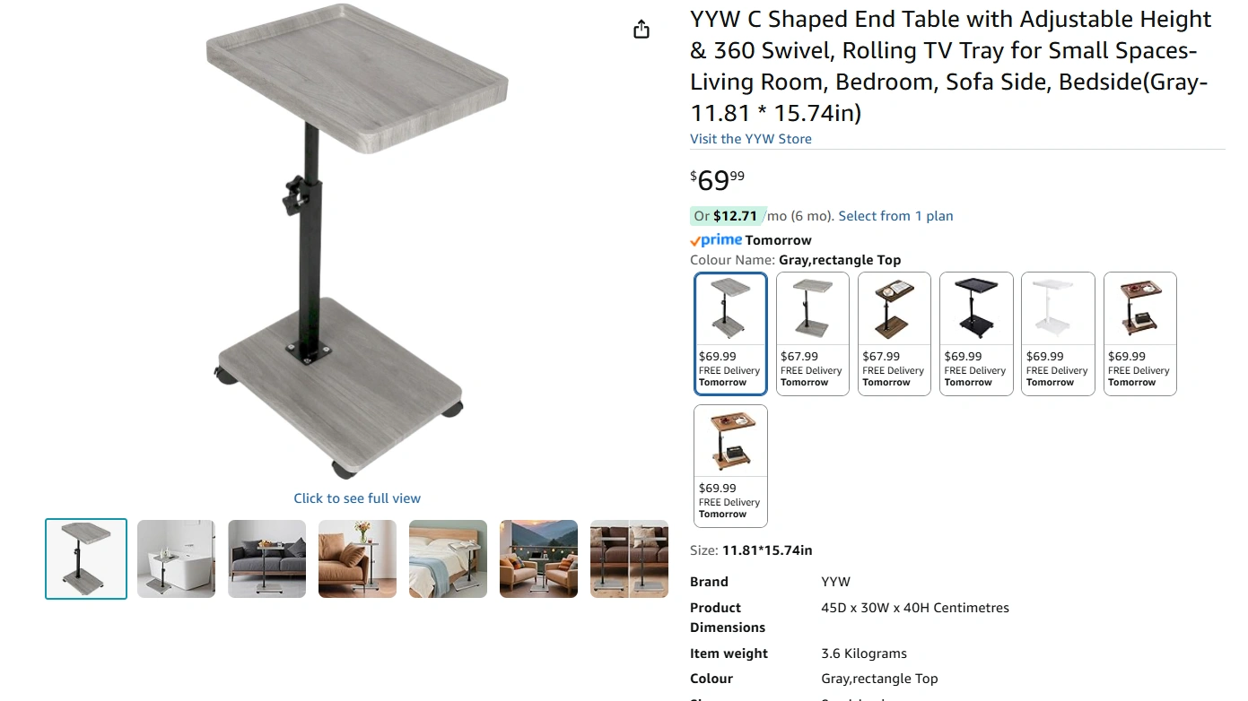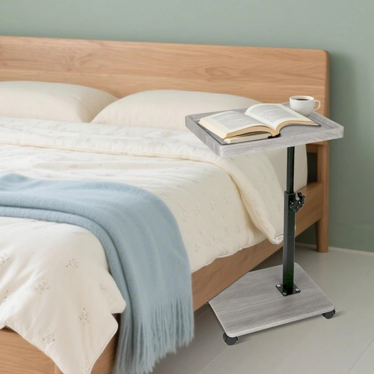 End Table with Adjustable Height & 360 Swivel, Rolling TV Tray for Small Spaces- Living Room, Bedroom, Sofa Side, Bedside(Gray-11.81 * 15.74in), Brand New in the Box/Sealed Features: 【Adjustable height and 360 °movement】YYW side table adopts a C-shaped design that can slide under the sofa/bed frame, saving space. The adjustable height range is 18-31 inches, and the height can be adjusted according to the needs of the bathtub, sofa, or bedside. The 360 ° rotating wheel can easily move between rooms. Very suitable for placing beverages, laptops, or books within reach without rearranging furniture 【Durable multifunctional tray】The stable structure made of thick steel frame and thickened wooden board has excellent load-bearing performance. YYW c shaped end table can be used to hold laptops for office work, serve as a book holder for reading, and also as a snack and beverage tray next to the sofa. The desktop and bottom have double layered storage space, making full use of vertical space to easily store various items, making the home environment clean and orderly 【Modern decoration with eternal charm】Selected durable raw materials, combining heavy texture and fashionable appearance, perfectly integrating with various home styles. Whether as a sofa side table in the living room, a bedside table in the bedroom, or a small storage table next to a lounge chair, it can add a touch of refinement to the space; It is also a thoughtful gift for family and friends, conveying the quality of life 【Easy to maintain】The unique raised design on the edge of the side table effectively prevents coffee and food from accidentally slipping off, safeguarding the cleanliness of the home. A high-quality wooden tabletop that is heat-resistant and waterproof. Daily cleaning only requires gentle wiping, making it easy to deal with stains and spills in daily life, and keeping the tabletop smooth and new for a long time 【Easy assembly】The YYW side table is equipped with parts and illustrations, with a scientifically reasonable structural design and clear and easy to understand installation steps. It does not require complex tools and can be easily assembled