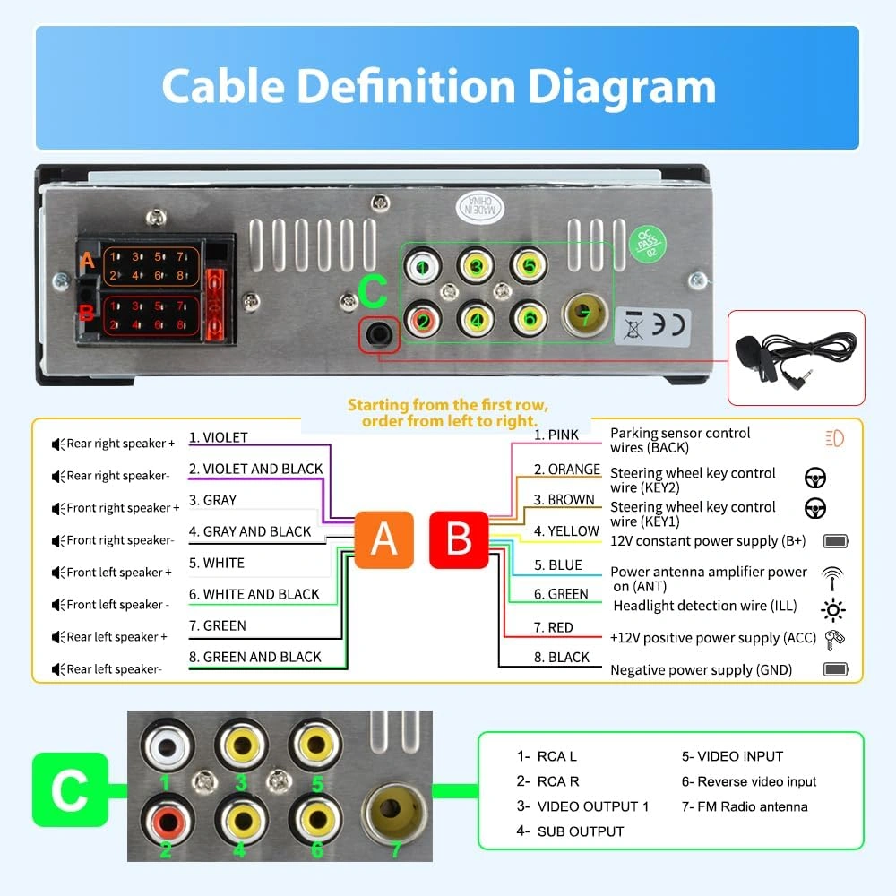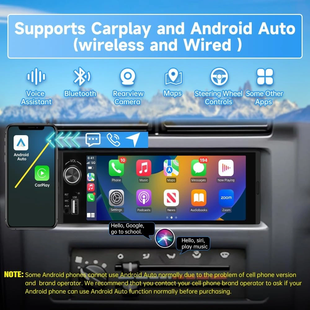 Single Din Car Stereo Touchscreen Radio 6.36 Inch, CarPlay & Android Auto HD IPS with Bluetooth with Backup Camera, Support USB Type-C Charging/USB/Mirror Link/Microphone/FM/EQ, Brand New in the Box/Sealed Features: ✅【Single Din Car Ttereo with Wired & Wireless CarPlay & Android Auto 】Enjoy effortless connectivity with both wired and wireless CarPlay and Android Auto. Simply connect via Bluetooth or USB to access navigation, music, calls, and messages directly on your single din car stereo’s touchscreen. Use Siri or G0*gle Assistant for hands-free control, keeping your focus on the road while enhancing your driving experience. ✅【Bluetooth, FM Radio & Customizable EQ】The single din touchscreen radio keeps you connected with built-in Bluetooth for hands-free calling and high-quality music streaming. Enjoy clear and uninterrupted FM radio reception, giving you access to your favorite stations. Customize your audio experience with an EQ, allowing you to fine-tune the sound for an immersive in-car listening experience. ✅【IPS Touchscreen with Versatile Connectivity】Enjoy a full-viewing angle IPS touchscreen that delivers clear visuals with accurate color rendition and brightness. Equipped with a Type-C fast charging port (2.1A), USB-A port for flash drives, AUX input, this single din car head unit wireless con bluetooth enhances both convenience and functionality. The intuitive volume knob allows quick adjustments, minimizing distractions for a safer driving experience. ✅【Waterproof HD Backup Camera and RCA output】Enhance parking safety with a ultra-wide-angle, waterproof HD backup camera that delivers clear 1080P night vision, even in low-light or rainy conditions. The system automatically switches to the rear view when reversing, making parking easier and safer. Supports RCA output, ensuring seamless integration with your car stereo. ✅【Mirror Link】Easily mirror your iOS or Android phone onto the car stereo display, allowing you to access navigation, music, videos, and other apps like G0*gle Maps, Spotify, and more for a more convenient and enjoyable driving experience. ✅【Important Notes】1.If the memory function doesn't work after power-off, it could be due to reversed wiring between the ACC wire (red) and the B+ wire (yellow). Ensure the yellow wire is connected to the positive terminal of the constant current battery to activate the memory function. 2.If can't turn on the car stereo, check the wiring. USE THE PROVIDED WIRING HARNESS, ensuring the yellow wire is connected to the positive terminal of the battery, the black wire to the negative terminal, and the red wire to the ACC (car key fob) for proper power supply. ✅【Important Notes】3.Ensure the red wire is connected to the ACC (car key fob) properly to make sure the single din car stereo turns off when the car is off, preventing it from staying on when the car is not running. 4.Make sure to insulate all wires correctly to prevent the positive and negative terminals from touching, avoiding short circuits or other safety hazards. 5.This single din car stereo works with 12-14.4V DC voltage, Max 15A. It can't be used for big trucks with 24V.
