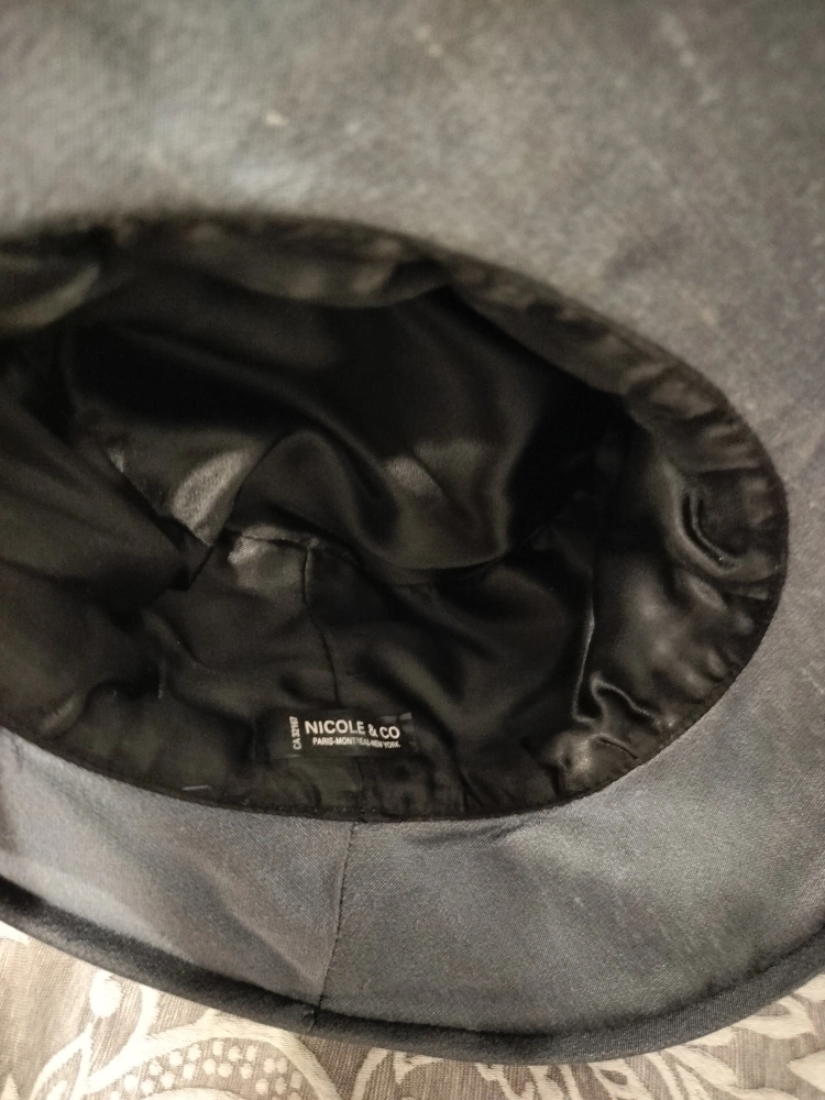 Here's a stylish black hat from Nicole & Co. It features a unique floral design around the brim, adding a touch of elegance to any outfit. Perfect for completing your look!
