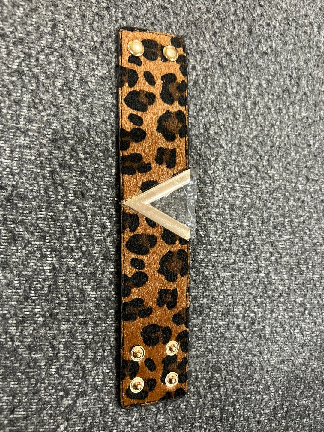 Here's a fun bracelet with a leopard print pattern! It features gold-tone accents and a unique design. Perfect for adding a touch of flair to any outfit