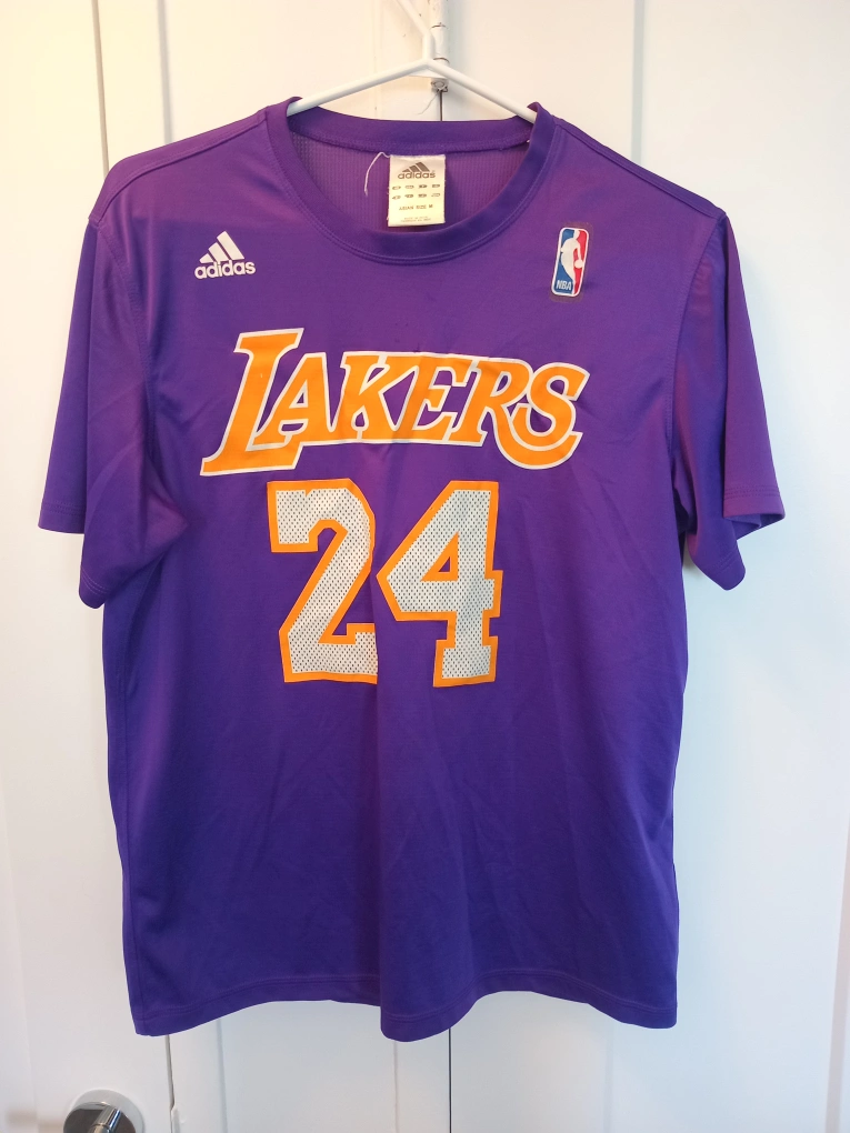 Selling an Adidas Lakers Kobe Bryant #24 T-Shirt. It's purple with the Lakers logo and Kobe Bryant's number on the front and back. Great for any basketball fan!