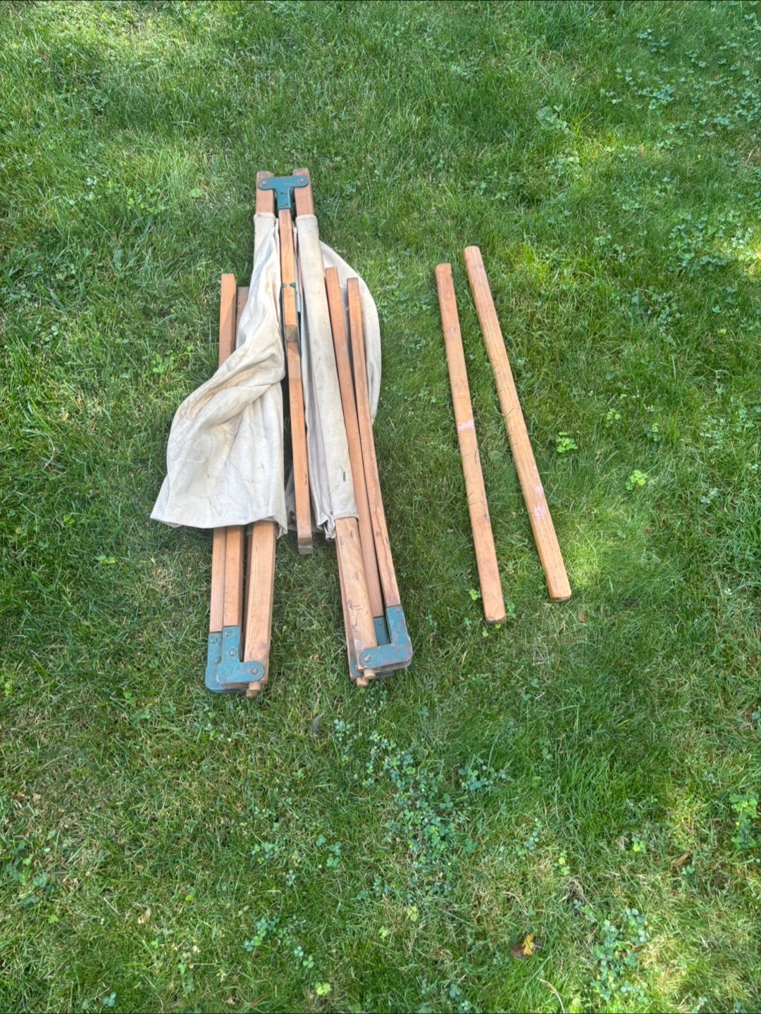 Selling a vintage army folding camp cot. It's in good condition and folds up for easy storage. Perfect for camping or as an extra bed for guests