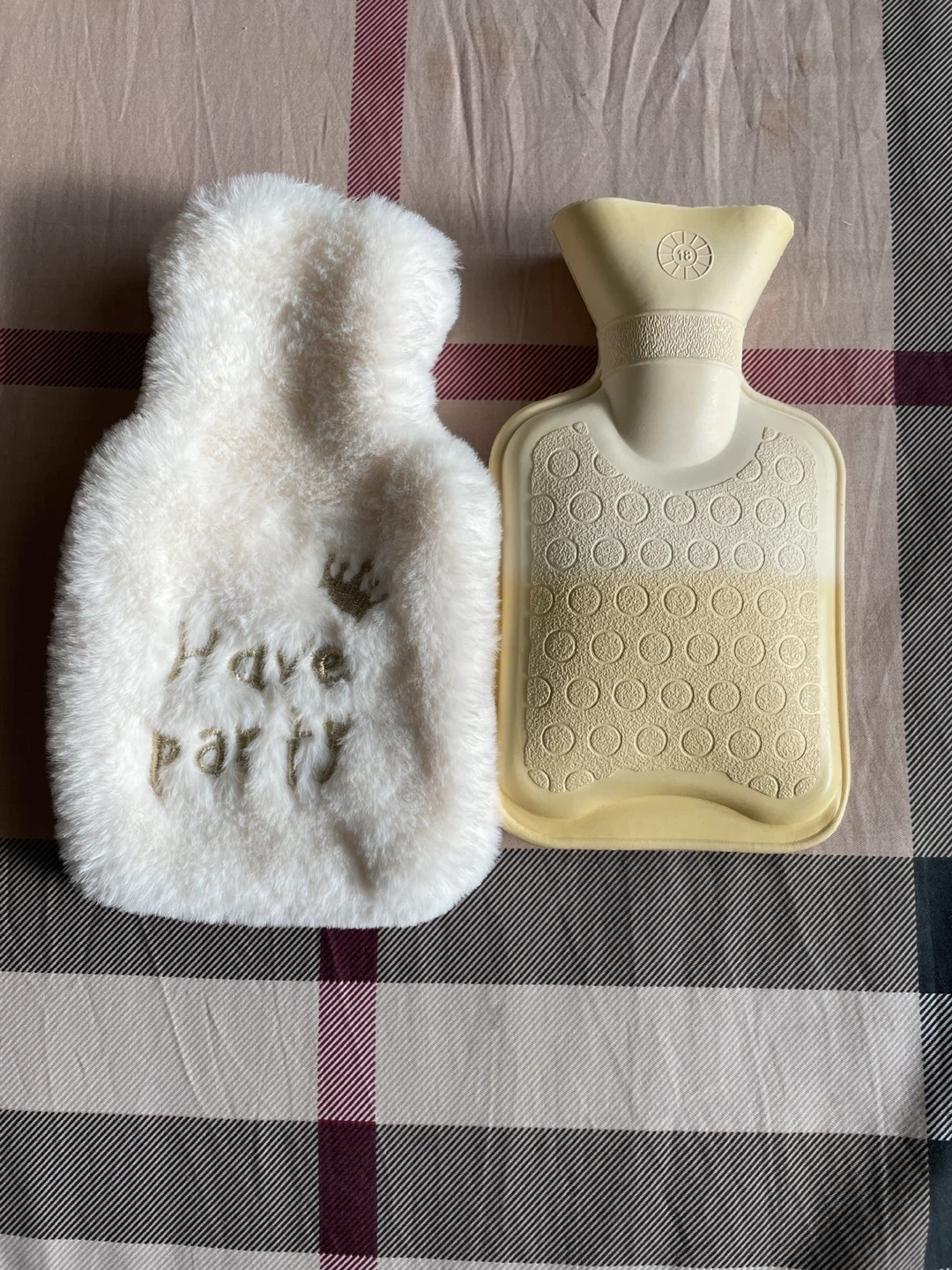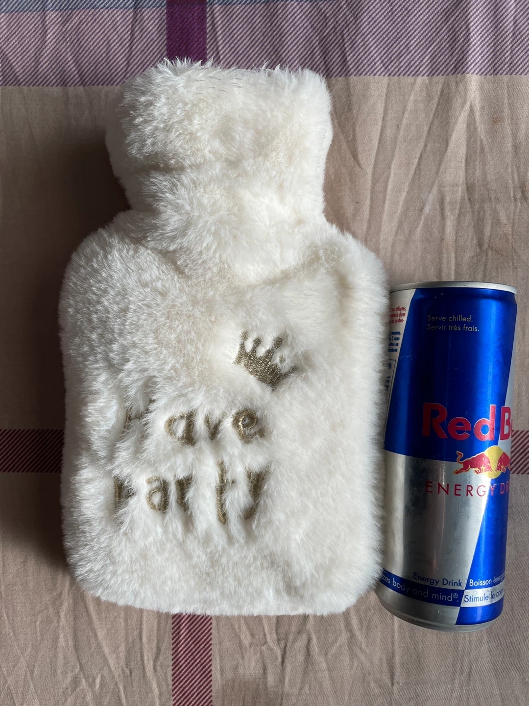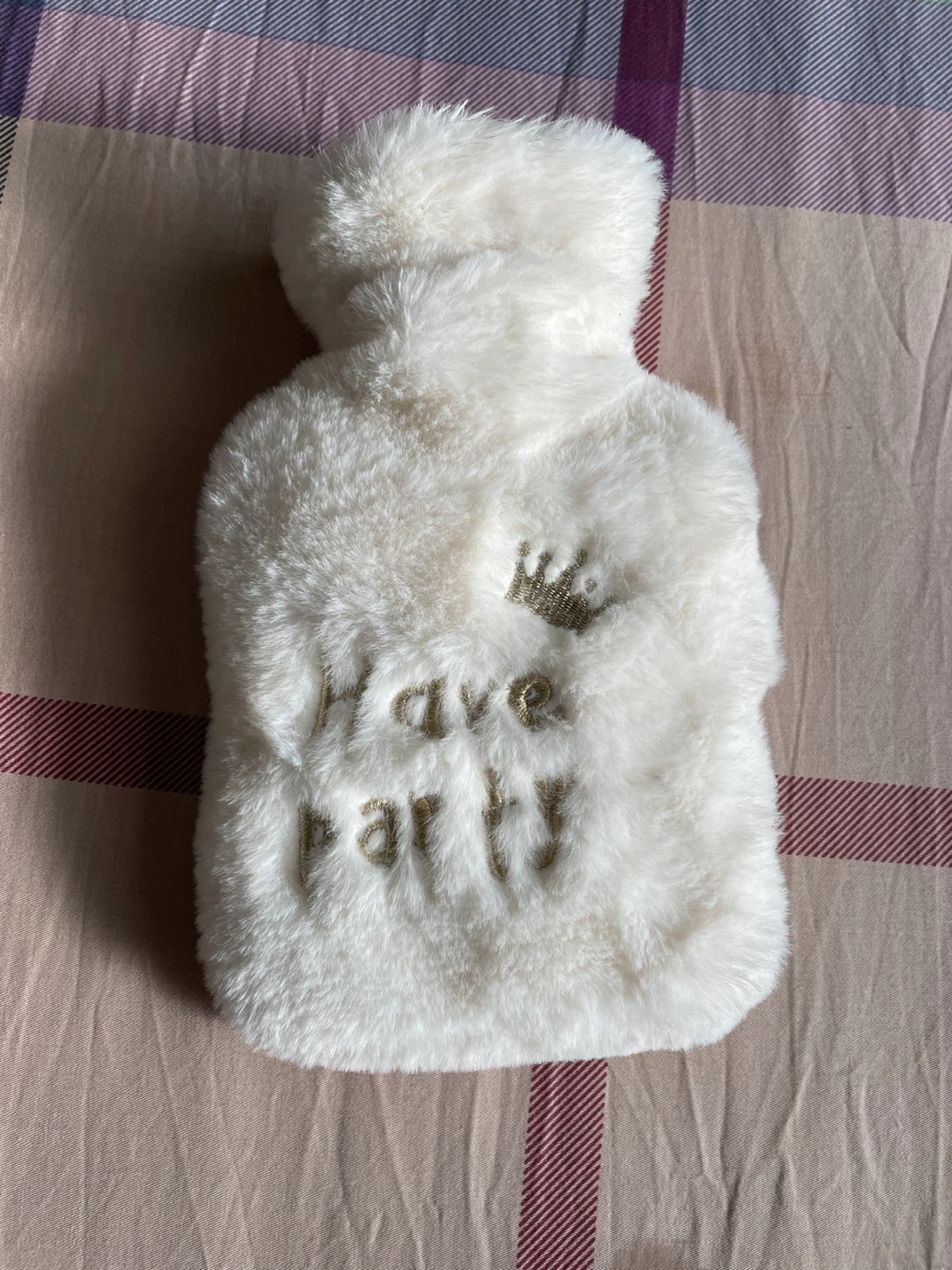 Cash only please. Cover still fluffy (not matted) Beer for size comparison. Good for Pain Relief from Arthritis, Headaches, Hot & Cold Therapy and Period Cramps Selling a hot water bottle with a soft, furry cover! It's in great shape and ready to keep you cozy on those chilly nights. The cover says "Have party" with a little crown above it. Perfect for snuggling up with a good book or soothing aches and pains