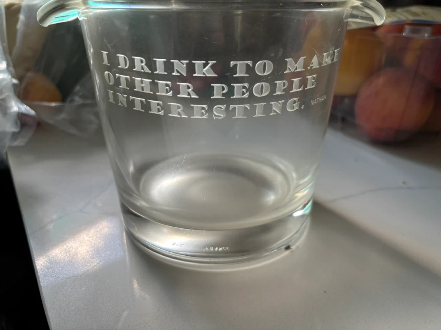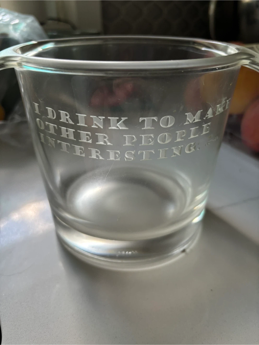 Selling a novelty glass with the phrase "I drink to make other people interesting" etched on the side. It's in great condition and ready for a new home! Picture doesn’t do it justice