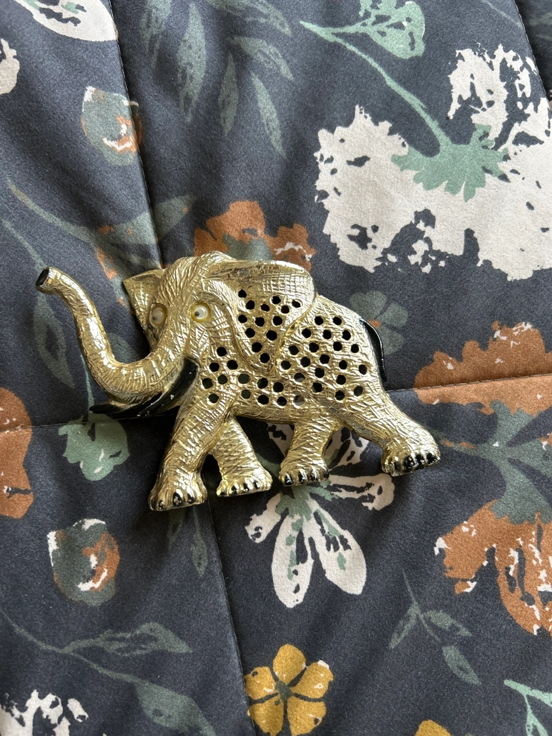 This is a lovely vintage gold elephant figurine. It has a unique design with small holes and pearl-like eyes. It would make a great addition to any collection or as a decorative piece for your home